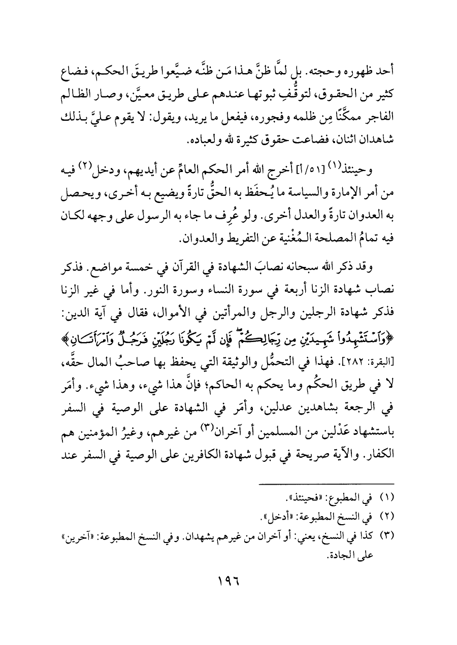 أحد ظهوره وحجته. بل لمَّا ظنَّ هذا مَن ظنَّه ضيَّعوا طريقَ الحكم، فضاع كثير من الحقوق، لتوقُّفِ ثبوتها عندهم على طريق معيَّن، وصار الظالم الفاجر ممكَّنًا مِن ظلمه وفجوره، فيفعل ما يريد، ويقول: لا يقوم عليَّ بذلك شاهدان اثنان، فضاعت حقوق كثيرة لله ولعباده.