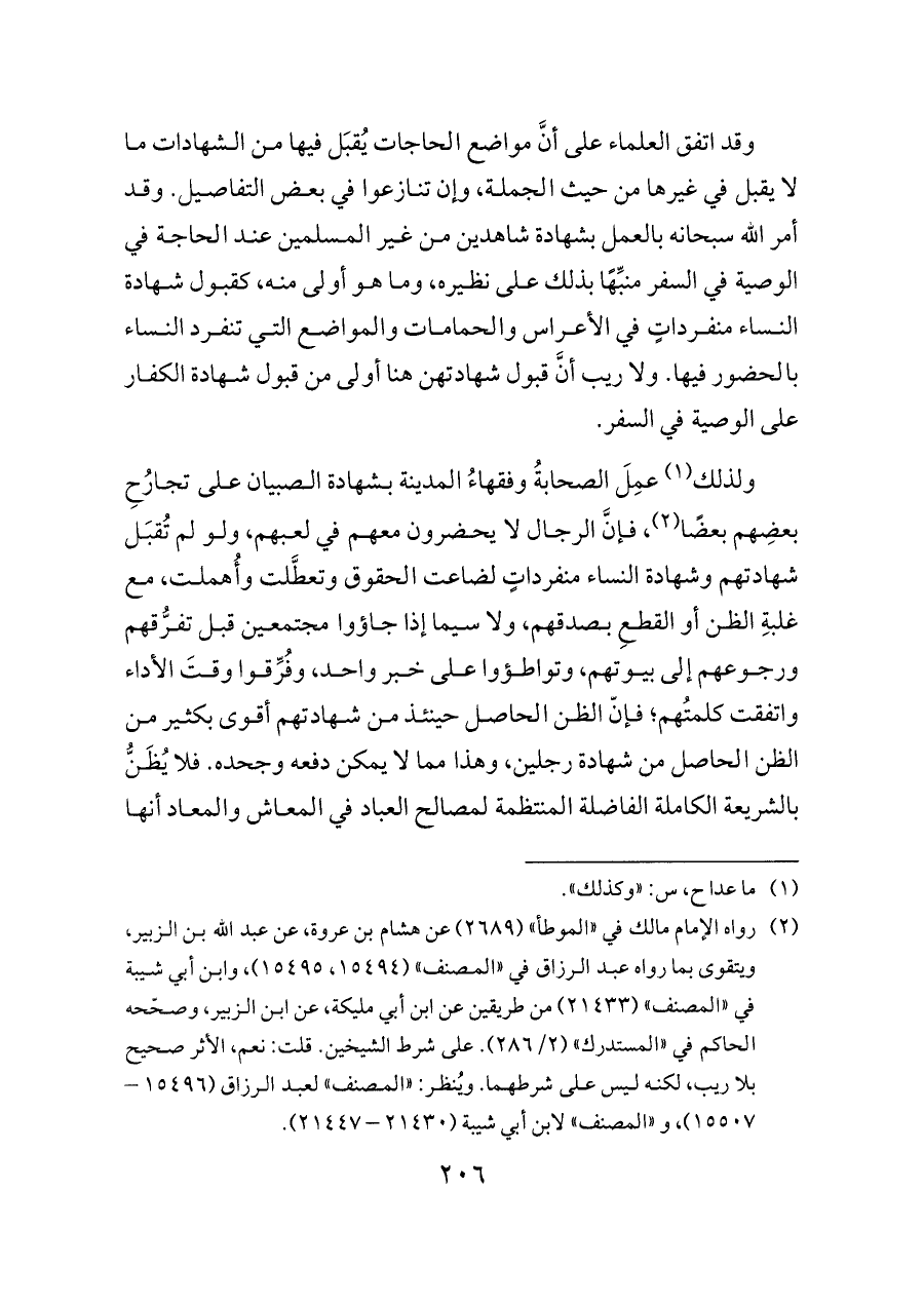 وقد اتفق العلماء على أنَّ مواضع الحاجات يُقبَل فيها من الشهادات ما لا يقبل في غيرها من حيث الجملة، وإن تنازعوا في بعض التفاصيل. وقد أمر الله سبحانه بالعمل بشهادة شاهدين من غير المسلمين عند الحاجة في الوصية في السفر منبِّهًا بذلك على نظيره، وما هو أولى منه، كقبول شهادة النساء منفرداتٍ في الأعراس والحمامات والمواضع التي تنفرد النساء بالحضور فيها. ولا ريب أنَّ قبول شهادتهن هنا أولى من قبول شهادة الكفار على الوصية في السفر.