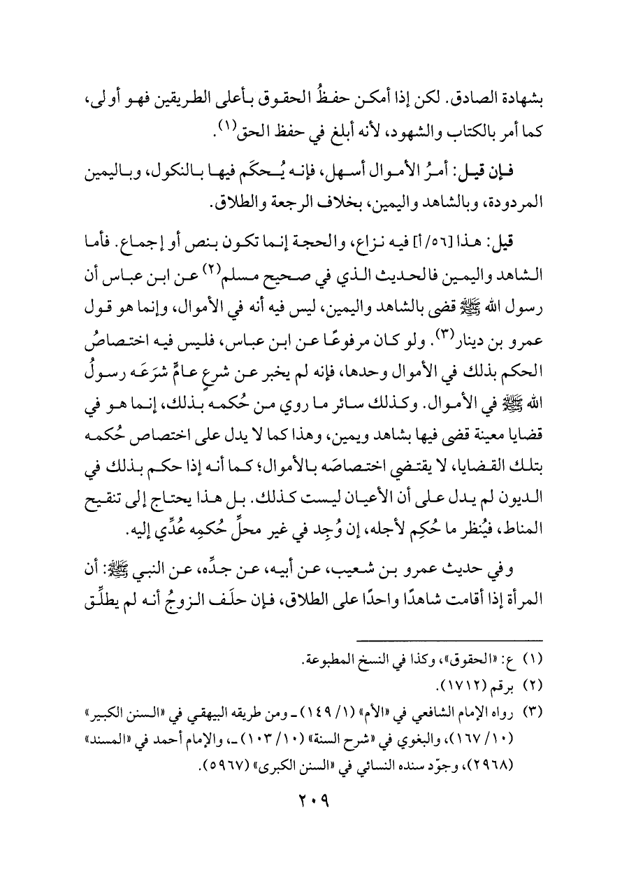 قيل: هذا [٥٦/أ] فيه نزاع، والحجة إنما تكون بنص أو إجماع. فأما الشاهد واليمين فالحديث الذي في صحيح مسلم (¬٢) عن ابن عباس أن رسول الله - صلى الله عليه وسلم - قضى بالشاهد واليمين، ليس فيه أنه في الأموال، وإنما هو قول عمرو بن دينار (¬٣). ولو كان مرفوعًا عن ابن عباس، فليس فيه اختصاصُ الحكم بذلك في الأموال وحدها، فإنه لم يخبر عن شرعٍ عامٍّ شرَعَه رسولُ الله - صلى الله عليه وسلم - في الأموال. وكذلك سائر ما روي من حُكمه بذلك، إنما هو في قضايا معينة قضى فيها بشاهد ويمين، وهذا كما لا يدل على اختصاص حُكمه بتلك القضايا، لا يقتضي اختصاصَه بالأموال؛ كما أنه إذا حكم بذلك في الديون لم يدل على أن الأعيان ليست كذلك. بل هذا يحتاج إلى تنقيح المناط، فيُنظر ما حُكِم لأجله، إن وُجِد في غير محلِّ حُكمِه عُدِّي إليه.