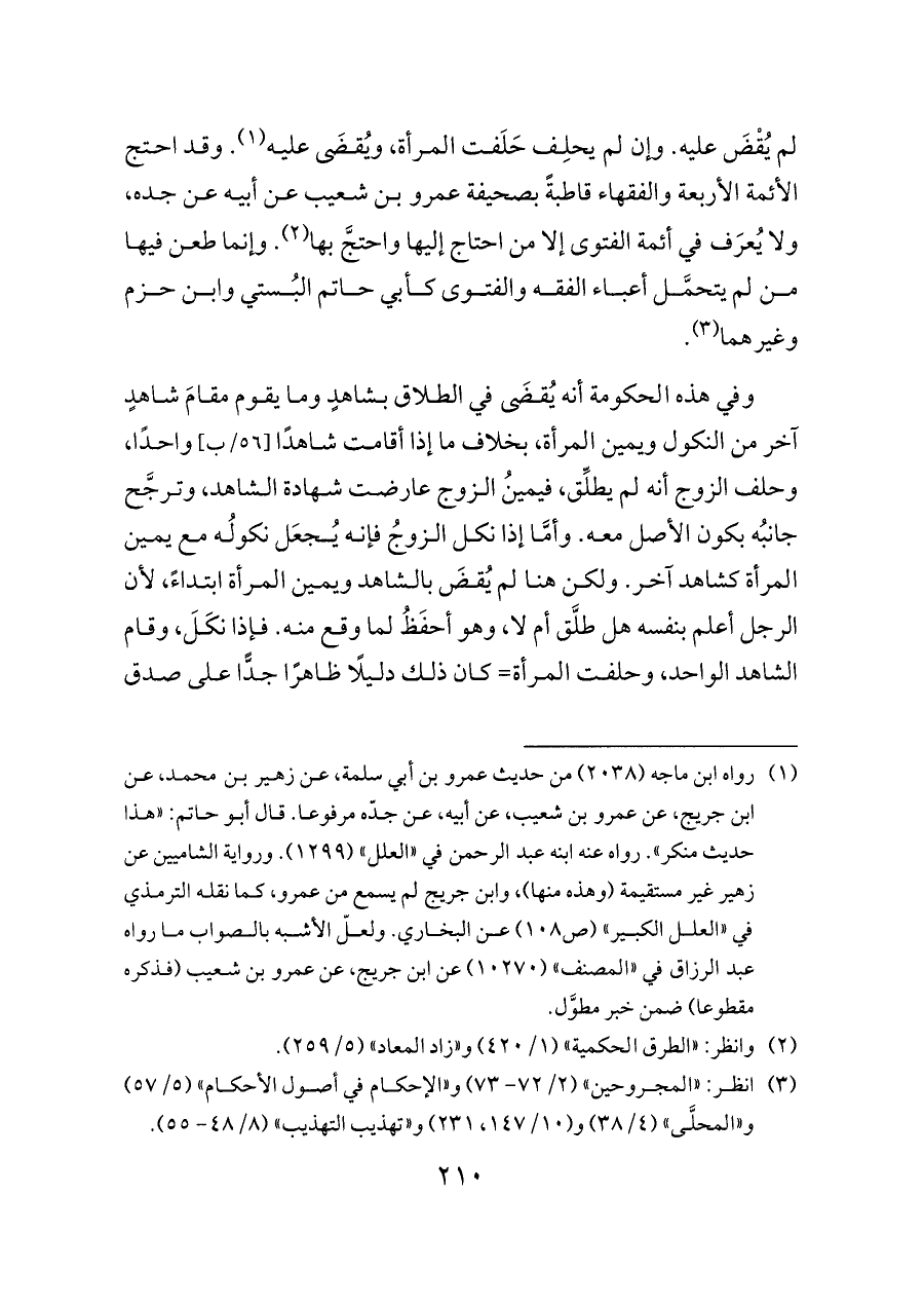 لم يُقْضَ عليه. وإن لم يحلِف حَلَفت المرأة، ويُقضَى عليه (¬١). وقد احتج الأئمة الأربعة والفقهاء قاطبةً بصحيفة عمرو بن شعيب عن أبيه عن جده، ولا يُعرَف في أئمة الفتوى إلا من احتاج إليها واحتجَّ بها (¬٢). وإنما طعن فيها من لم يتحمَّل أعباء الفقه والفتوى كأبي حاتم البُستي وابن حزم وغيرهما (¬٣).