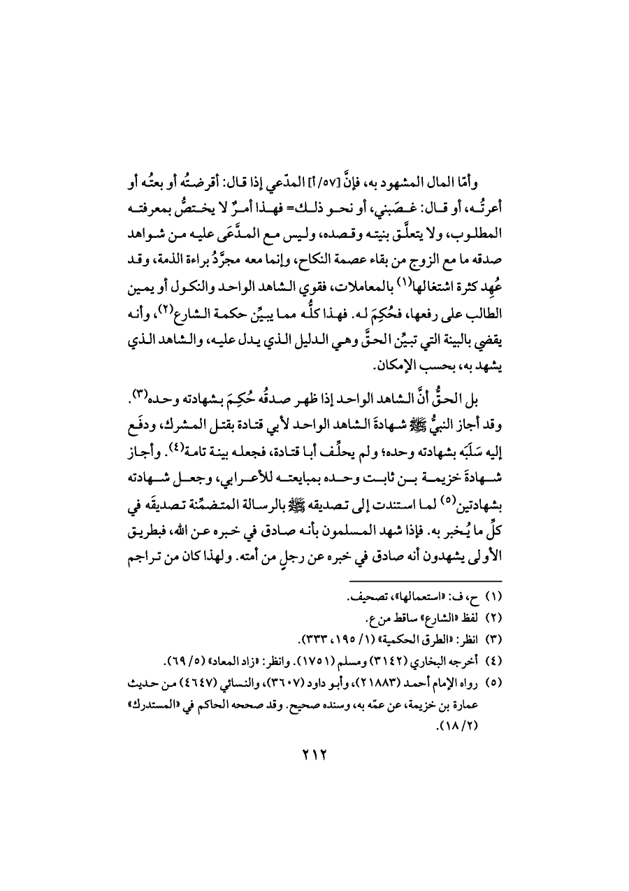 بل الحقُّ أنَّ الشاهد الواحد إذا ظهر صدقُه حُكِمَ بشهادته وحده (¬٣). وقد أجاز النبيُّ - صلى الله عليه وسلم - شهادةَ الشاهد الواحد لأبي قتادة بقتل المشرك، ودفَع إليه سَلَبَه بشهادته وحده؛ ولم يحلِّف أبا قتادة، فجعله بينة تامة (¬٤). وأجاز شهادةَ خزيمة بن ثابت وحده بمبايعته للأعرابي، وجعل شهادته بشهادتين (¬٥) لما استندت إلى تصديقه - صلى الله عليه وسلم - بالرسالة المتضمِّنة تصديقَه في كلِّ ما يُخبر به. فإذا شهد المسلمون بأنه صادق في خبره عن الله، فبطريق الأولى يشهدون أنه صادق في خبره عن رجلٍ من أمته. ولهذا كان من تراجم