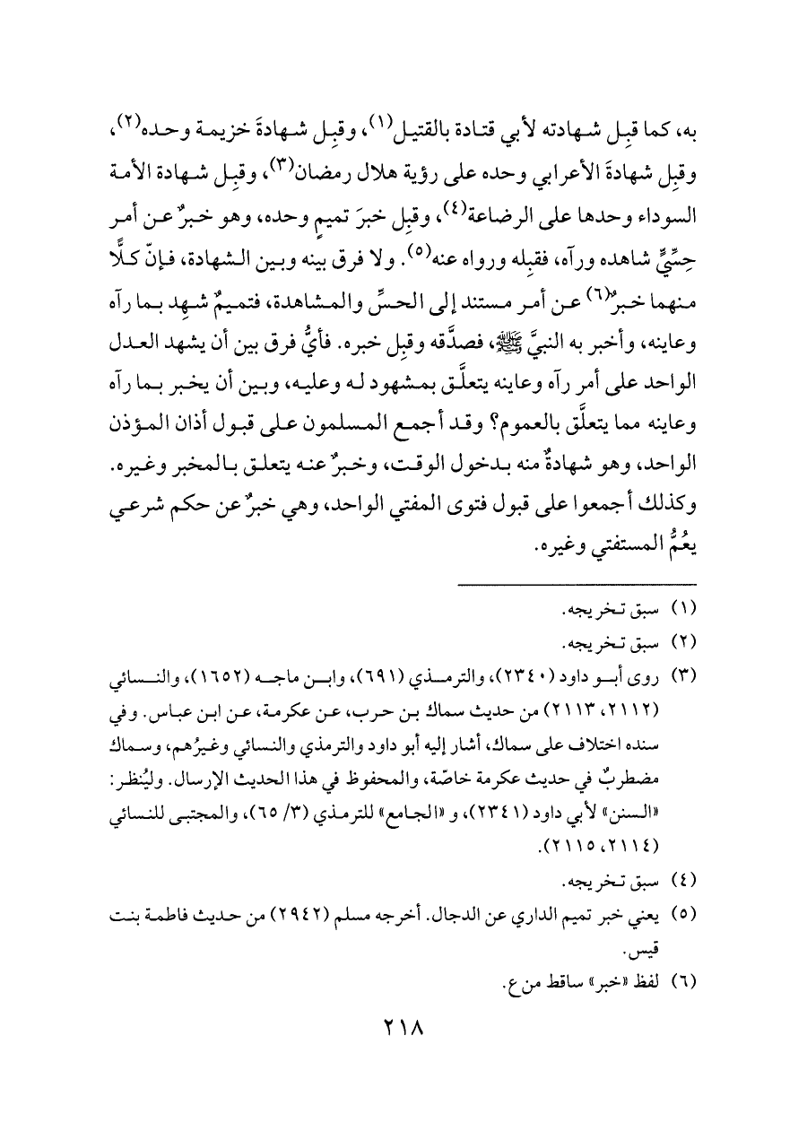 به، كما قبِل شهادته لأبي قتادة بالقتيل (¬١)، وقبِل شهادةَ خزيمة وحده (¬٢)، وقبِل شهادةَ الأعرابي وحده على رؤية هلال رمضان (¬٣)، وقبِل شهادة الأمة السوداء وحدها على الرضاعة (¬٤)، وقبِل خبرَ تميمٍ وحده، وهو خبرٌ عن أمر حِسِّيٍّ شاهده ورآه، فقبِله ورواه عنه (¬٥). ولا فرق بينه وبين الشهادة، فإنّ كلًّا منهما خبرٌ (¬٦) عن أمر مستند إلى الحسِّ والمشاهدة، فتميمٌ شهِد بما رآه وعاينه، وأخبر به النبيَّ - صلى الله عليه وسلم -، فصدَّقه وقبِل خبره. فأيُّ فرق بين أن يشهد العدل الواحد على أمر رآه وعاينه يتعلَّق بمشهود له وعليه، وبين أن يخبر بما رآه وعاينه مما يتعلَّق بالعموم؟ وقد أجمع المسلمون على قبول أذان المؤذن الواحد، وهو شهادةٌ منه بدخول الوقت، وخبرٌ عنه يتعلق بالمخبر وغيره. وكذلك أجمعوا على قبول فتوى المفتي الواحد، وهي خبرٌ عن حكم شرعي يعُمُّ المستفتي وغيره.