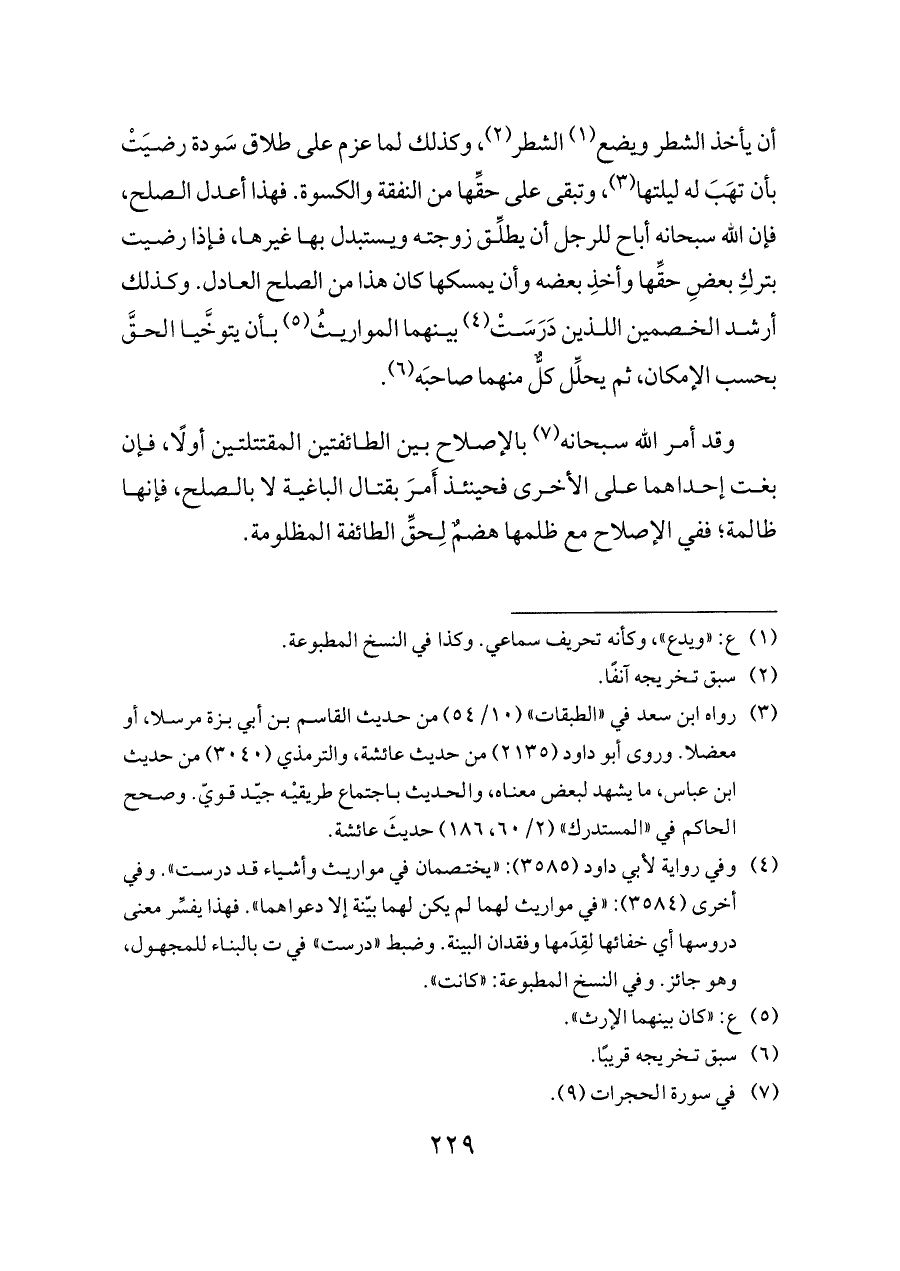 أن يأخذ الشطر ويضع (¬١) الشطر (¬٢)، وكذلك لما عزم على طلاق سَودة رضيَتْ بأن تهَبَ له ليلتها (¬٣)، وتبقى على حقِّها من النفقة والكسوة. فهذا أعدل الصلح، فإن الله سبحانه أباح للرجل أن يطلِّق زوجته ويستبدل بها غيرها، فإذا رضيت بتركِ بعضِ حقِّها وأخذِ بعضه وأن يمسكها كان هذا من الصلح العادل. وكذلك أرشد الخصمين اللذين دَرَسَتْ (¬٤) بينهما المواريثُ (¬٥) بأن يتوخَّيا الحقَّ بحسب الإمكان، ثم يحلِّل كلٌّ منهما صاحبَه (¬٦).