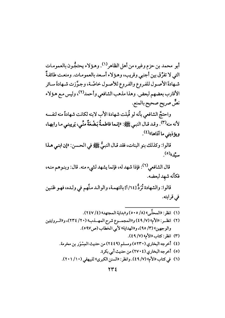 واحتجَّ الشافعي بأنه لو قُبلت شهادة الأب لابنه لكانت شهادةً منه لنفسه لأنه منه (¬٣). وقد قال النبي - صلى الله عليه وسلم -: "إنما فاطمةُ بَضْعَةٌ منِّي، يَريبني ما رابها، ويؤذيني ما آذاها" (¬٤).