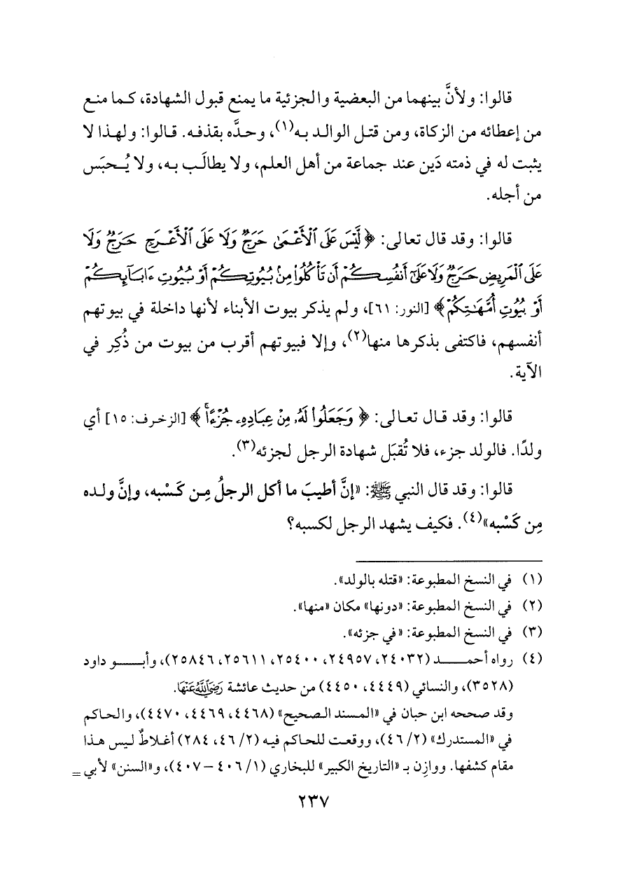 قالوا: وقد قال النبي - صلى الله عليه وسلم -: "إنَّ أطيبَ ما أكل الرجلُ مِن كَسْبه، وإنَّ ولده مِن كَسْبه" (¬٤). فكيف يشهد الرجل لكسبه؟