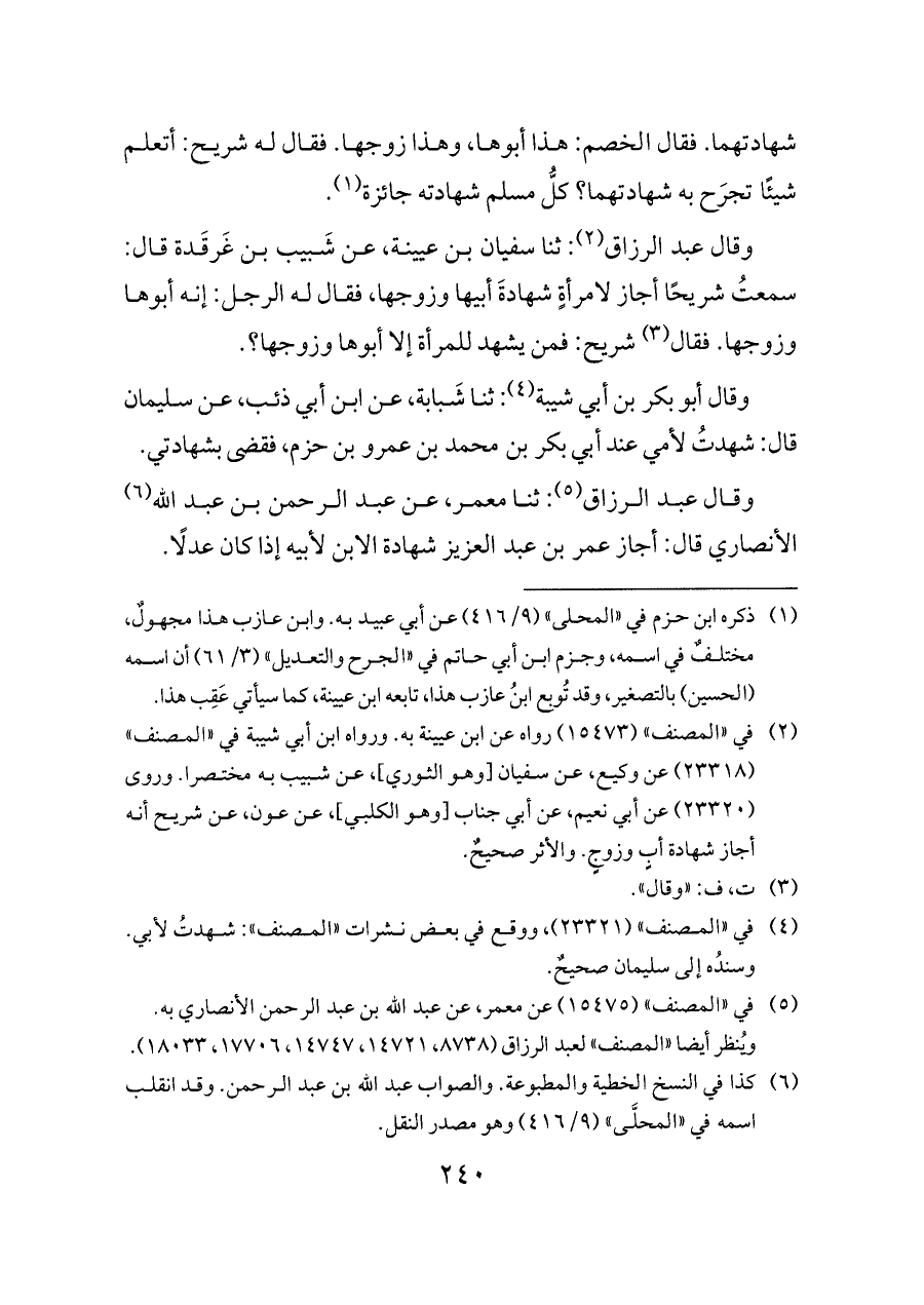 (¬٢) في "المصنف" (١٥٤٧٣) رواه عن ابن عيينة به. ورواه ابن أبي شيبة في "المصنف" (٢٣٣١٨) عن وكيع، عن سفيان [وهو الثوري]، عن شبيب به مختصرا. وروى (٢٣٣٢٠) عن أبي نعيم، عن أبي جناب [وهو الكلبي]، عن عون، عن شريح أنه أجاز شهادة أبٍ وزوجٍ. والأثر صحيحٌ.