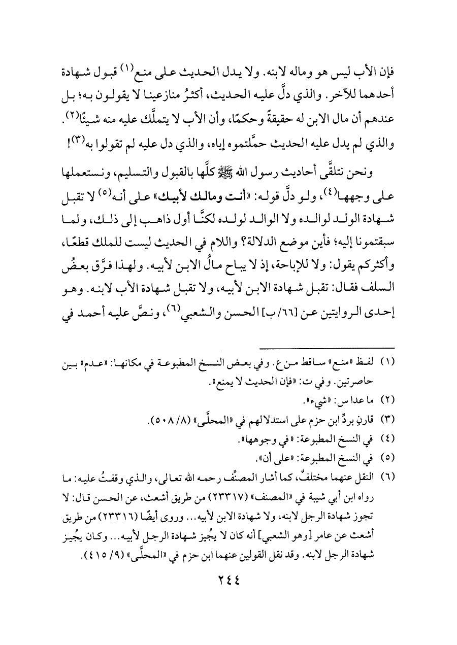 ونحن نتلقَّى أحاديث رسول الله - صلى الله عليه وسلم - كلَّها بالقبول والتسليم، ونستعملها على وجهها (¬٤)، ولو دلَّ قوله: "أنت ومالك لأبيك" على أنه (¬٥) لا تقبل شهادة الولد لوالده ولا الوالد لولده لكنَّا أول ذاهب إلى ذلك، ولما سبقتمونا إليه؛ فأين موضع الدلالة؟ واللام في الحديث ليست للملك قطعًا، وأكثركم يقول: ولا للإباحة، إذ لا يباح مالُ الابن لأبيه. ولهذا فرَّق بعضُ السلف فقال: تقبل شهادة الابن لأبيه، ولا تقبل شهادة الأب لابنه. وهو إحدى الروايتين عن [٦٦/ب] الحسن والشعبي (¬٦)، ونصَّ عليه أحمد في