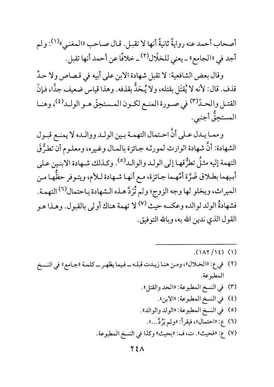 ومما يدل على أنَّ احتمال التهمة بين الولد ووالده لا يمنع قبول الشهادة: أنَّ شهادة الوارث لمورثه جائزة بالمال وغيره، ومعلوم أن تطرُّقَ التهمة إليه مثلُ تطرُّقها إلى الولد والوالد (¬٥). وكذلك شهادة الابنين على أبيهما بطلاق ضَرَّة أمِّهما جائزة، مع أنها شهادة للأم، ويتوفر حظُّها من الميراث، ويخلو لها وجه الزوج؛ ولم تُرَدَّ هذه الشهادة باحتمال (¬٦) التهمة. فشهادةُ الولد لوالده وعكسه حيث (¬٧) لا تهمة هناك أولى بالقبول. وهذا هو القول الذي ندين الله به، وبالله التوفيق.