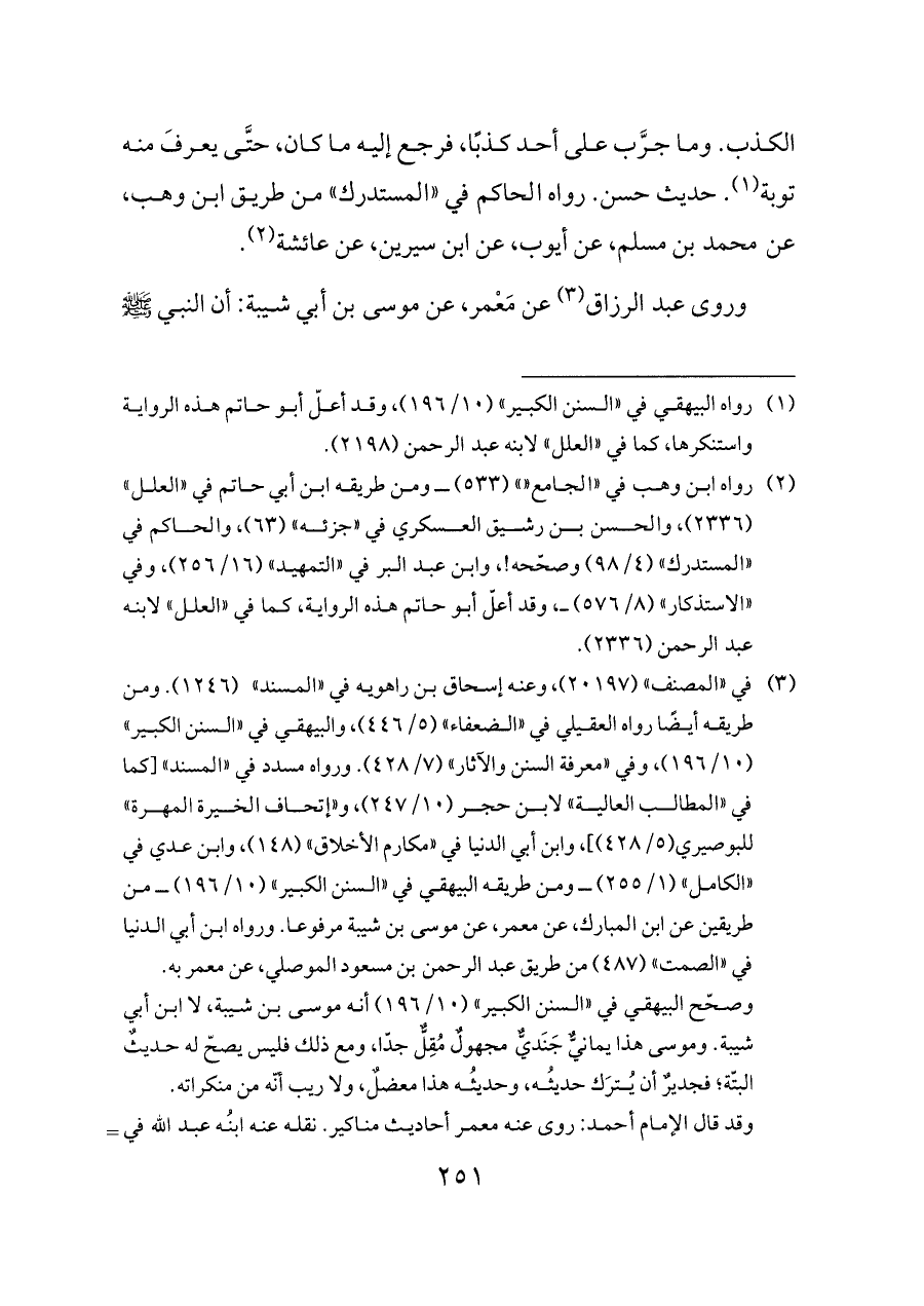 الكذب. وما جرَّب على أحد كذبًا، فرجع إليه ما كان، حتَّى يعرفَ منه توبة (¬١). حديث حسن. رواه الحاكم في "المستدرك" من طريق ابن وهب، عن محمد بن مسلم، عن أيوب، عن ابن سيرين، عن عائشة (¬٢).