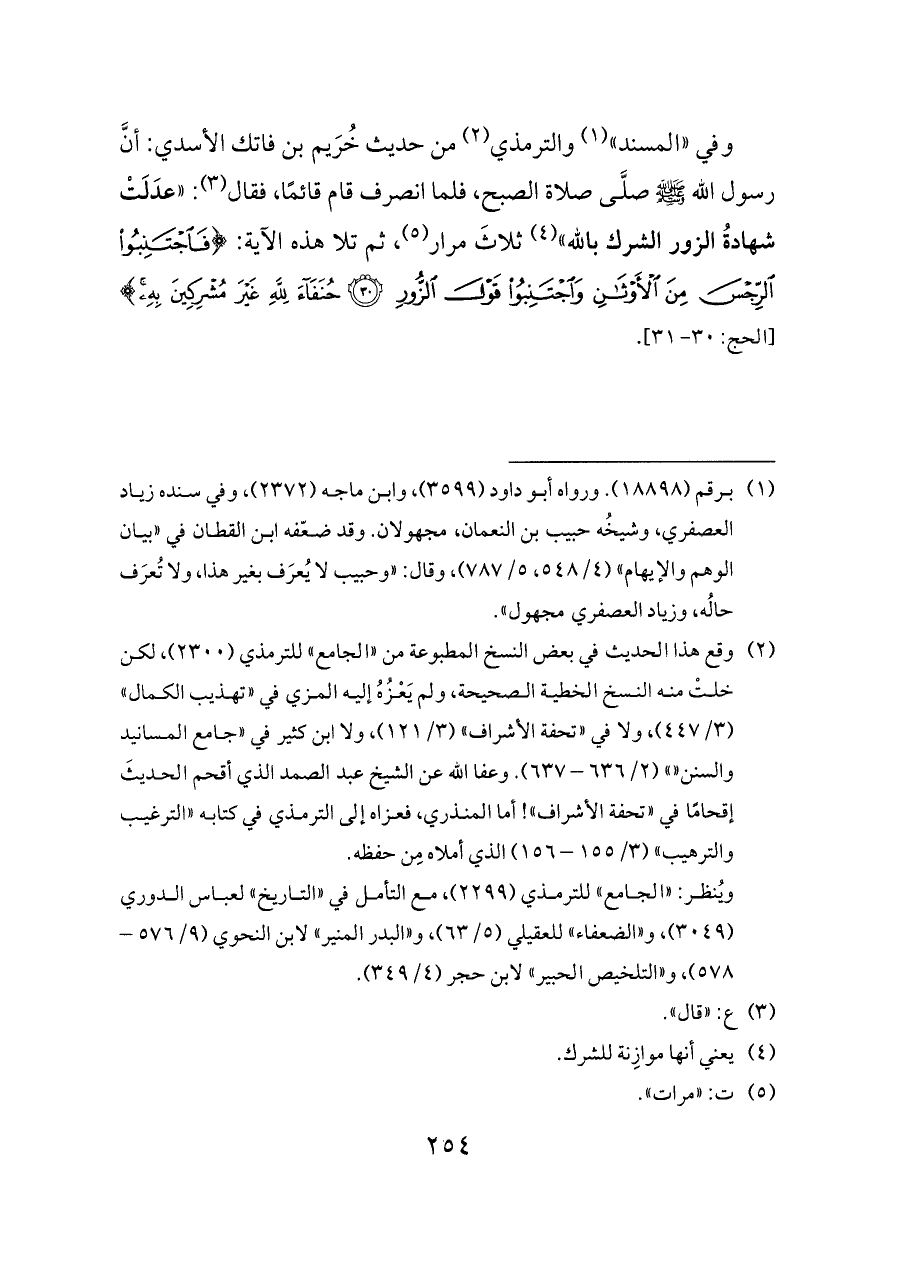 وفي "المسند" (¬١) والترمذي (¬٢) من حديث خُرَيم بن فاتك الأسدي: أنَّ رسول الله - صلى الله عليه وسلم - صلَّى صلاة الصبح، فلما انصرف قام قائمًا، فقال (¬٣): "عدَلَتْ شهادةُ الزور الشرك بالله" (¬٤) ثلاثَ مرار (¬٥)، ثم تلا هذه الآية: {فَاجْتَنِبُوا الرِّجْسَ مِنَ الْأَوْثَانِ وَاجْتَنِبُوا قَوْلَ الزُّورِ (٣٠) حُنَفَاءَ لِلَّهِ غَيْرَ مُشْرِكِينَ بِهِ} [الحج: ٣٠ - ٣١].