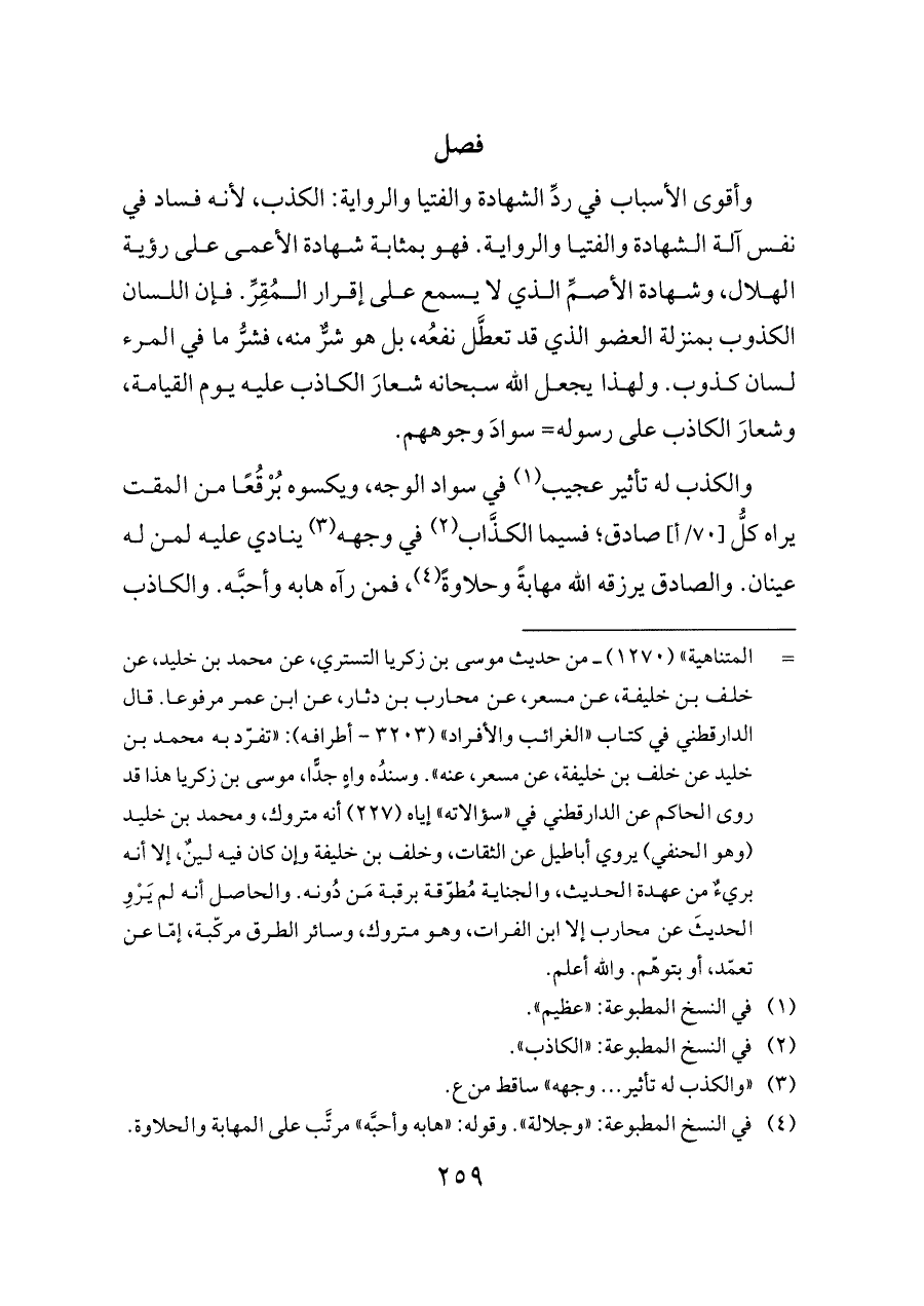 وأقوى الأسباب في ردِّ الشهادة والفتيا والرواية: الكذب، لأنه فساد في نفس آلة الشهادة والفتيا والرواية. فهو بمثابة شهادة الأعمى على رؤية الهلال، وشهادة الأصمِّ الذي لا يسمع على إقرار المُقِرِّ. فإن اللسان الكذوب بمنزلة العضو الذي قد تعطَّل نفعُه، بل هو شرٌّ منه، فشرُّ ما في المرء لسان كذوب. ولهذا يجعل الله سبحانه شعارَ الكاذب عليه يوم القيامة، وشعارَ الكاذب على رسوله= سوادَ وجوههم.