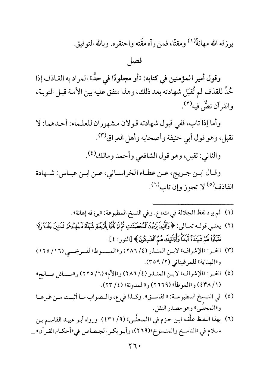(¬٢) يعني قوله تعالى: {وَالَّذِينَ يَرْمُونَ الْمُحْصَنَاتِ ثُمَّ لَمْ يَأْتُوا بِأَرْبَعَةِ شُهَدَاءَ فَاجْلِدُوهُمْ ثَمَانِينَ جَلْدَةً وَلَا تَقْبَلُوا لَهُمْ شَهَادَةً أَبَدًا وَأُولَئِكَ هُمُ الْفَاسِقُونَ} [النور: ٤].