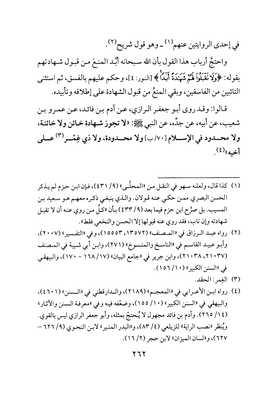 (¬١) كذا قال، ولعله سهو في النقل من "المحلَّى" (٩/ ٤٣١)، فإن ابن حزم لم يذكر الحسن البصري ممن حكي عنه قولان. والذي ينبغي ذكره معهم هو سعيد بن المسيب. بل صرَّح ابن حزم فيما بعد (٩/ ٤٣٣) بأن "كلَّ من روي عنه أن لا تقبل شهادته وإن تاب، فقد روي عنه قبولها إلا الحسن والنخعي فقط".