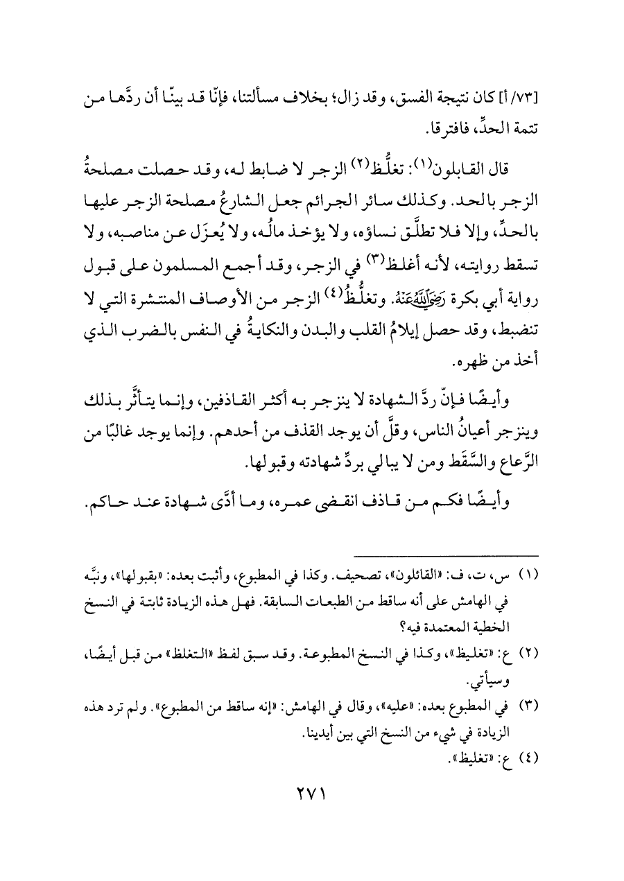 (¬٢) ع: "تغليظ"، وكذا في النسخ المطبوعة. وقد سبق لفظ "التغلظ" من قبل أيضًا، وسيأتي.