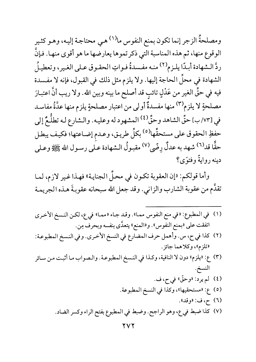 ومصلحةُ الزجر إنما تكون بمنع النفوس ما (¬١) هي محتاجة إليه، وهو كثير الوقوع منها، ثم هذه المناسبة التي ذكرتموها يعارضها ما هو أقوى منها. فإنَّ ردَّ الشهادة أبدًا يلزم (¬٢) منه مفسدةُ فواتِ الحقوق على الغير، وتعطيلُ الشهادة في محلِّ الحاجة إليها. ولا يلزم مثل ذلك في القبول، فإنه لا مفسدة فيه في حقِّ الغير من عَدْلٍ تائبٍ قد أصلح ما بينه وبين الله. ولا ريب أنَّ اعتبارَ مصلحةٍ لا يلزم (¬٣) منها مفسدةٌ أولى من اعتبار مصلحةٍ يلزم منها عدَّةُ مفاسد في [٧٣/ب] حقِّ الشاهد وحقِّ (¬٤) المشهود له وعليه. والشارع له تطلُّعٌ إلى حفظِ الحقوق على مستحقِّها (¬٥) بكلِّ طريق، وعدمِ إضاعتها؛ فكيف يبطل حقًّا قد (¬٦) شهد به عدلٌ رِضًى (¬٧) مقبولُ الشهادة على رسول الله - صلى الله عليه وسلم - وعلى دينه روايةً وفتوَى؟