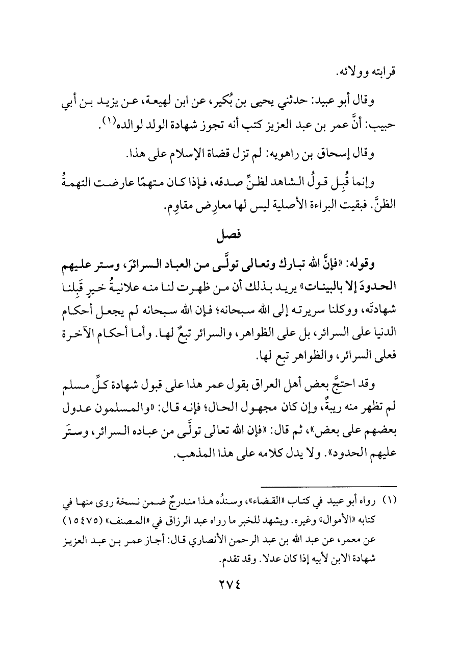 (¬١) رواه أبو عبيد في كتاب "القضاء"، وسندُه هذا مندرجٌ ضمن نسخة روى منها في كتابه "الأموال" وغيره. ويشهد للخبر ما رواه عبد الرزاق في "المصنف" (١٥٤٧٥) عن معمر، عن عبد الله بن عبد الرحمن الأنصاري قال: أجاز عمر بن عبد العزيز شهادة الابن لأبيه إذا كان عدلا. وقد تقدم.