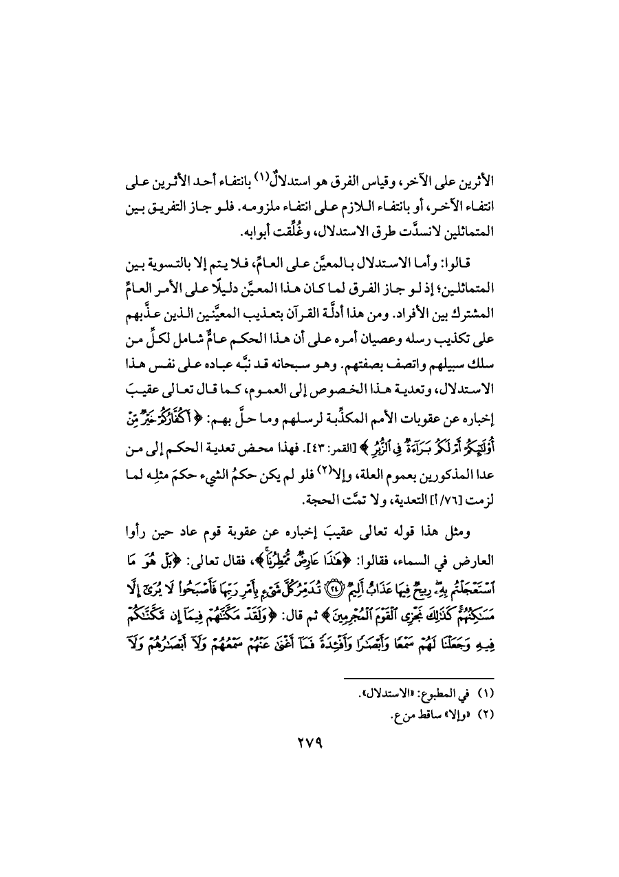 قالوا: وأما الاستدلال بالمعيَّن على العامِّ، فلا يتم إلا بالتسوية بين المتماثلين؛ إذ لو جاز الفرق لما كان هذا المعيَّن دليلًا على الأمر العامِّ المشترك بين الأفراد. ومن هذا أدلَّة القرآن بتعذيب المعيَّنين الذين عذَّبهم على تكذيب رسله وعصيان أمره على أن هذا الحكم عامٌّ شامل لكلِّ من سلك سبيلهم واتصف بصفتهم. وهو سبحانه قد نبَّه عباده على نفس هذا الاستدلال، وتعدية هذا الخصوص إلى العموم، كما قال تعالى عقيبَ إخباره عن عقوبات الأمم المكذِّبة لرسلهم وما حلَّ بهم: {أَكُفَّارُكُمْ خَيْرٌ مِنْ أُولَئِكُمْ أَمْ لَكُمْ بَرَاءَةٌ فِي الزُّبُرِ} [القمر: ٤٣]. فهذا محض تعدية الحكم إلى من عدا المذكورين بعموم العلة، وإلا (¬٢) فلو لم يكن حكمُ الشيء حكمَ مثلِه لما لزمت [٧٦/أ] التعدية، ولا تمَّت الحجة.