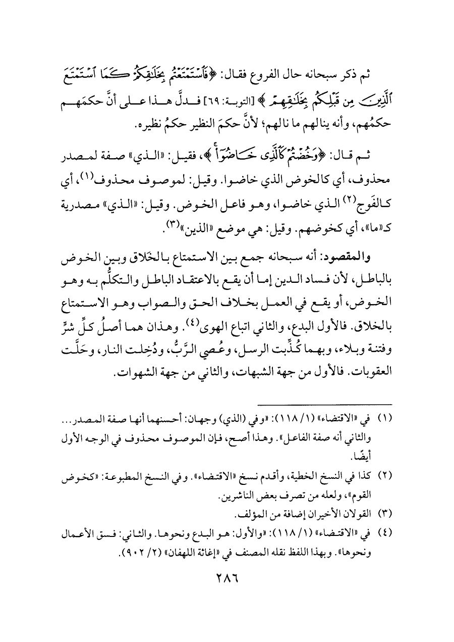 (¬١) في "الاقتضاء" (١/ ١١٨): "وفي (الذي) وجهان: أحسنهما أنها صفة المصدر ... والثاني أنه صفة الفاعل". وهذا أصح، فإن الموصوف محذوف في الوجه الأول أيضًا.