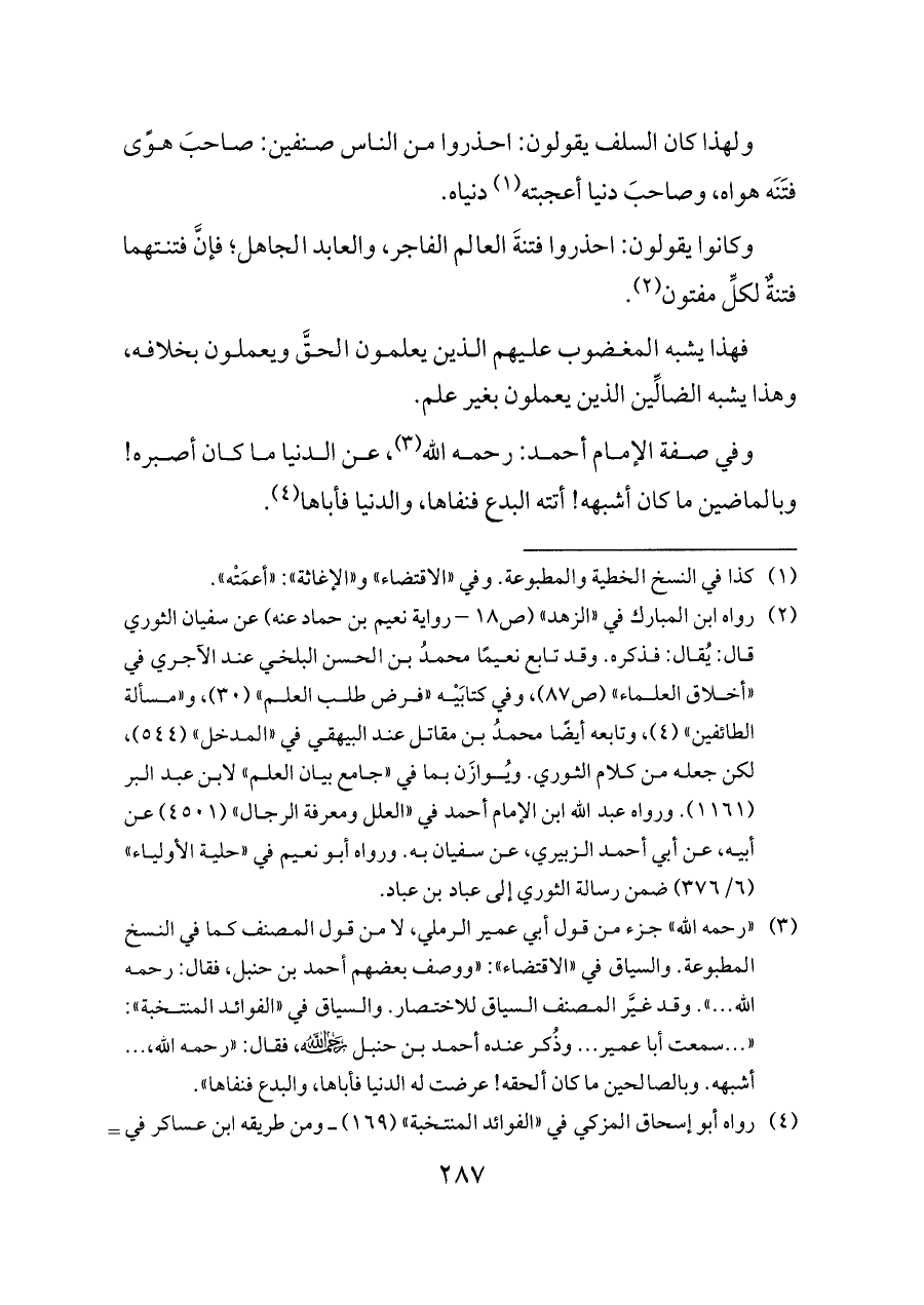 (¬٣) "رحمه الله" جزء من قول أبي عمير الرملي، لا من قول المصنف كما في النسخ المطبوعة. والسياق في "الاقتضاء": "ووصف بعضهم أحمد بن حنبل، فقال: رحمه الله ... ". وقد غيَّر المصنف السياق للاختصار. والسياق في "الفوائد المنتخبة": " ... سمعت أبا عمير ... وذُكر عنده أحمد بن حنبل - رحمه الله -، فقال: "رحمه الله، ... أشبهه. وبالصالحين ما كان ألحقه! عرضت له الدنيا فأباها، والبدع فنفاها".