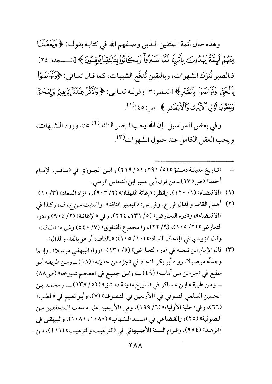 وهذه حال أئمة المتقين الذين وصفهم الله في كتابه بقوله: {وَجَعَلْنَا مِنْهُمْ أَئِمَّةً يَهْدُونَ بِأَمْرِنَا لَمَّا صَبَرُوا وَكَانُوا بِآيَاتِنَا يُوقِنُونَ} [السجدة: ٢٤]. فبالصبر تُترَك الشهوات، وباليقين تُدفَع الشبهات، كما قال تعالى: {وَتَوَاصَوْا بِالْحَقِّ وَتَوَاصَوْا بِالصَّبْرِ} [العصر: ٣] وقوله تعالى: {وَاذْكُرْ عِبَادَنَا إِبْرَاهِيمَ وَإِسْحَاقَ وَيَعْقُوبَ أُولِي الْأَيْدِي وَالْأَبْصَارِ} [ص: ٤٥] (¬١).