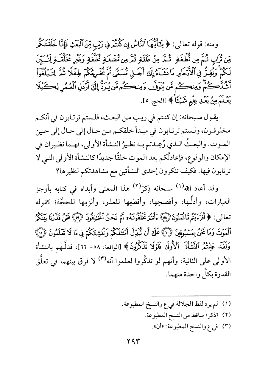 ومنه: قوله تعالى: {يَاأَيُّهَا النَّاسُ إِنْ كُنْتُمْ فِي رَيْبٍ مِنَ الْبَعْثِ فَإِنَّا خَلَقْنَاكُمْ مِنْ تُرَابٍ ثُمَّ مِنْ نُطْفَةٍ ثُمَّ مِنْ عَلَقَةٍ ثُمَّ مِنْ مُضْغَةٍ مُخَلَّقَةٍ وَغَيْرِ مُخَلَّقَةٍ لِنُبَيِّنَ لَكُمْ وَنُقِرُّ فِي الْأَرْحَامِ مَا نَشَاءُ إِلَى أَجَلٍ مُسَمًّى ثُمَّ نُخْرِجُكُمْ طِفْلًا ثُمَّ لِتَبْلُغُوا أَشُدَّكُمْ وَمِنْكُمْ مَنْ يُتَوَفَّى وَمِنْكُمْ مَنْ يُرَدُّ إِلَى أَرْذَلِ الْعُمُرِ لِكَيْلَا يَعْلَمَ مِنْ بَعْدِ عِلْمٍ شَيْئًا} [الحج: ٥].