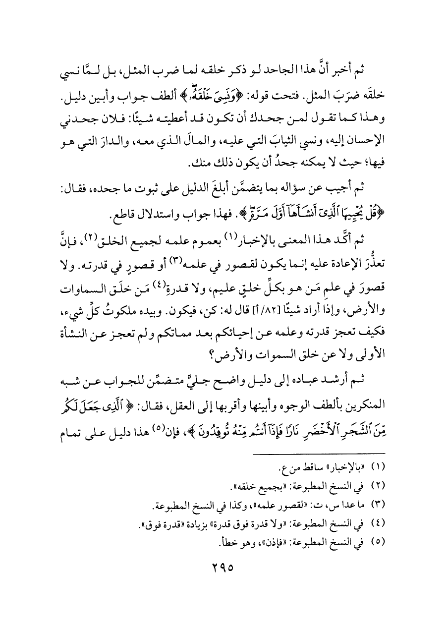 ثم أخبر أنَّ هذا الجاحد لو ذكر خلقه لما ضرب المثل، بل لمَّا نسي خلقَه ضرَبَ المثل. فتحت قوله: {وَنَسِيَ خَلْقَهُ} ألطف جواب وأبين دليل. وهذا كما تقول لمن جحدك أن تكون قد أعطيته شيئًا: فلان جحدني الإحسان إليه، ونسي الثيابَ التي عليه، والمالَ الذي معه، والدارَ التي هو فيها؛ حيث لا يمكنه جحدُ أن يكون ذلك منك.