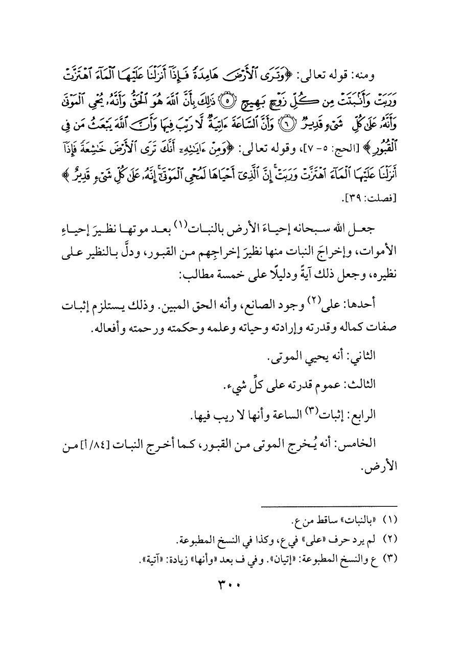 ومنه: قوله تعالى: {وَتَرَى الْأَرْضَ هَامِدَةً فَإِذَا أَنْزَلْنَا عَلَيْهَا الْمَاءَ اهْتَزَّتْ وَرَبَتْ وَأَنْبَتَتْ مِنْ كُلِّ زَوْجٍ بَهِيجٍ (٥) ذَلِكَ بِأَنَّ اللَّهَ هُوَ الْحَقُّ وَأَنَّهُ يُحْيِ الْمَوْتَى وَأَنَّهُ عَلَى كُلِّ شَيْءٍ قَدِيرٌ (٦) وَأَنَّ السَّاعَةَ آتِيَةٌ لَا رَيْبَ فِيهَا وَأَنَّ اللَّهَ يَبْعَثُ مَنْ فِي الْقُبُورِ} [الحج: ٥ - ٧]، وقوله تعالى: {وَمِنْ آيَاتِهِ أَنَّكَ تَرَى الْأَرْضَ خَاشِعَةً فَإِذَا أَنْزَلْنَا عَلَيْهَا الْمَاءَ اهْتَزَّتْ وَرَبَتْ إِنَّ الَّذِي أَحْيَاهَا لَمُحْيِ الْمَوْتَى إِنَّهُ عَلَى كُلِّ شَيْءٍ قَدِيرٌ} [فصلت: ٣٩].