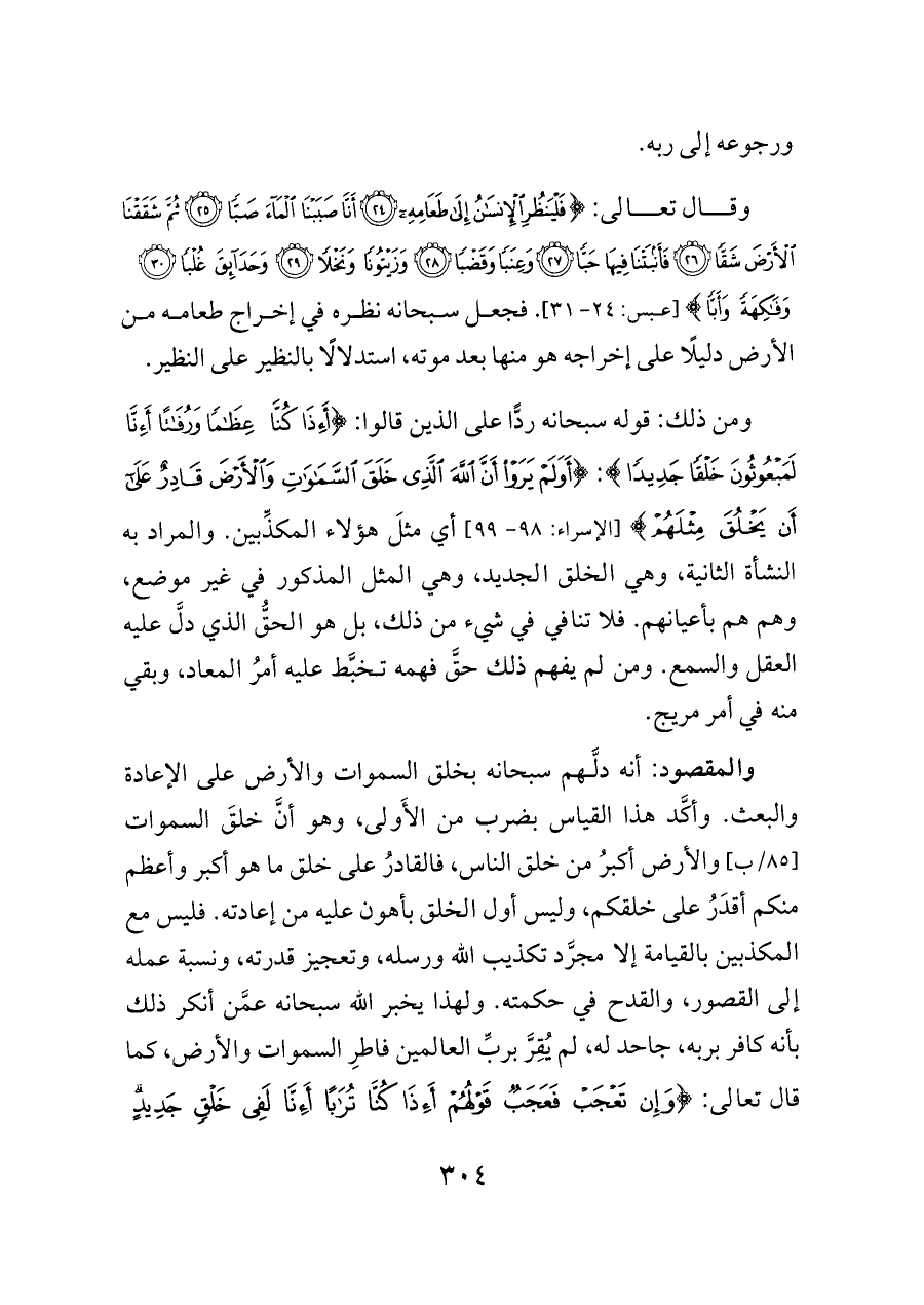 وقال تعالى: {فَلْيَنْظُرِ الْإِنْسَانُ إِلَى طَعَامِهِ (٢٤) أَنَّا صَبَبْنَا الْمَاءَ صَبًّا (٢٥) ثُمَّ شَقَقْنَا الْأَرْضَ شَقًّا (٢٦) فَأَنْبَتْنَا فِيهَا حَبًّا (٢٧) وَعِنَبًا وَقَضْبًا (٢٨) وَزَيْتُونًا وَنَخْلًا (٢٩) وَحَدَائِقَ غُلْبًا (٣٠) وَفَاكِهَةً وَأَبًّا} [عبس: ٢٤ - ٣١]. فجعل سبحانه نظره في إخراج طعامه من الأرض دليلًا على إخراجه هو منها بعد موته، استدلالًا بالنظير على النظير.