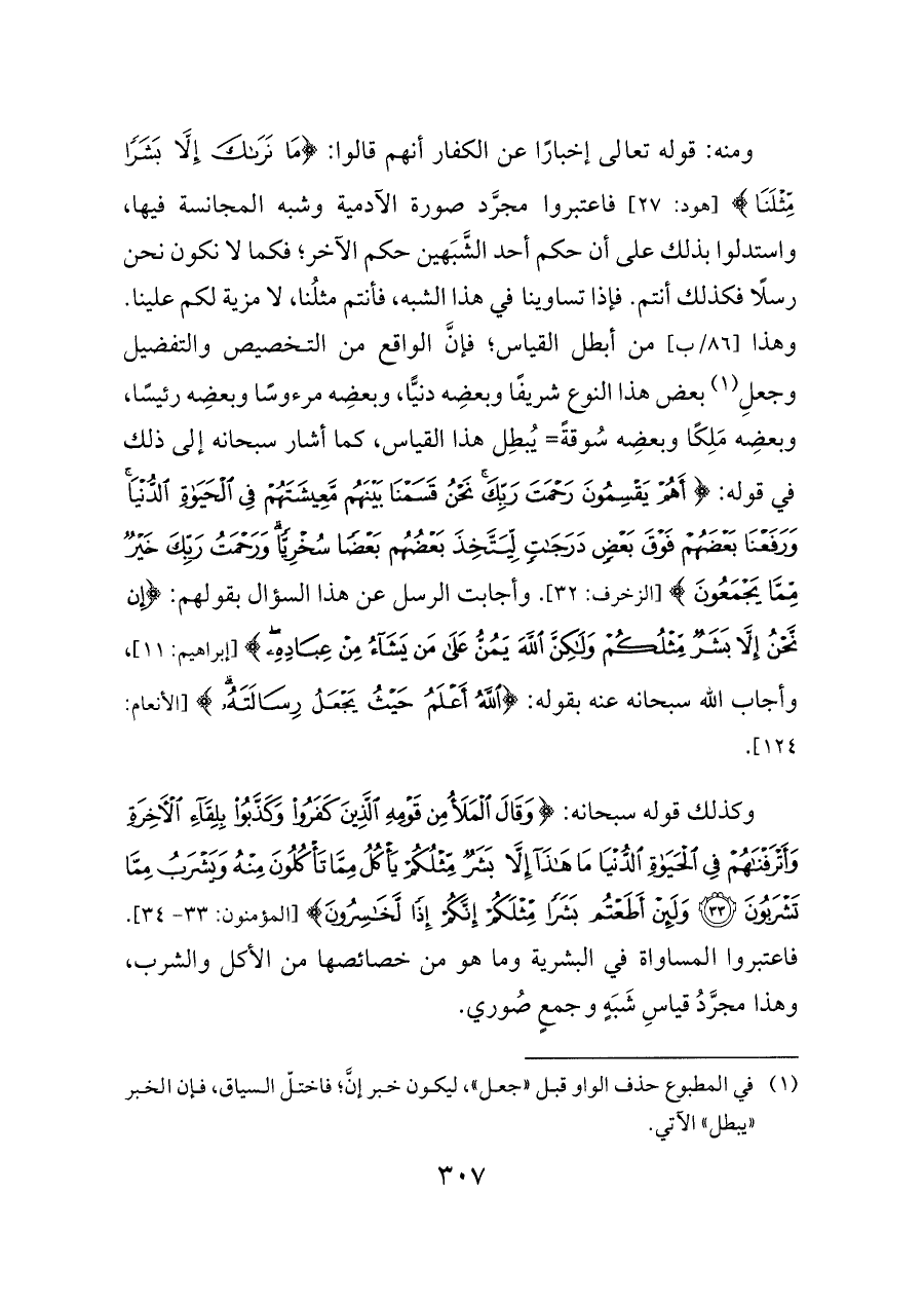 وكذلك قوله سبحانه: {وَقَالَ الْمَلَأُ مِنْ قَوْمِهِ الَّذِينَ كَفَرُوا وَكَذَّبُوا بِلِقَاءِ الْآخِرَةِ وَأَتْرَفْنَاهُمْ فِي الْحَيَاةِ الدُّنْيَا مَا هَذَا إِلَّا بَشَرٌ مِثْلُكُمْ يَأْكُلُ مِمَّا تَأْكُلُونَ مِنْهُ وَيَشْرَبُ مِمَّا تَشْرَبُونَ (٣٣) وَلَئِنْ أَطَعْتُمْ بَشَرًا مِثْلَكُمْ إِنَّكُمْ إِذًا لَخَاسِرُونَ} [المؤمنون: ٣٣ - ٣٤]. فاعتبروا المساواة في البشرية وما هو من خصائصها من الأكل والشرب، وهذا مجرَّدُ قياسِ شَبَهٍ وجمعٍ صُوري.