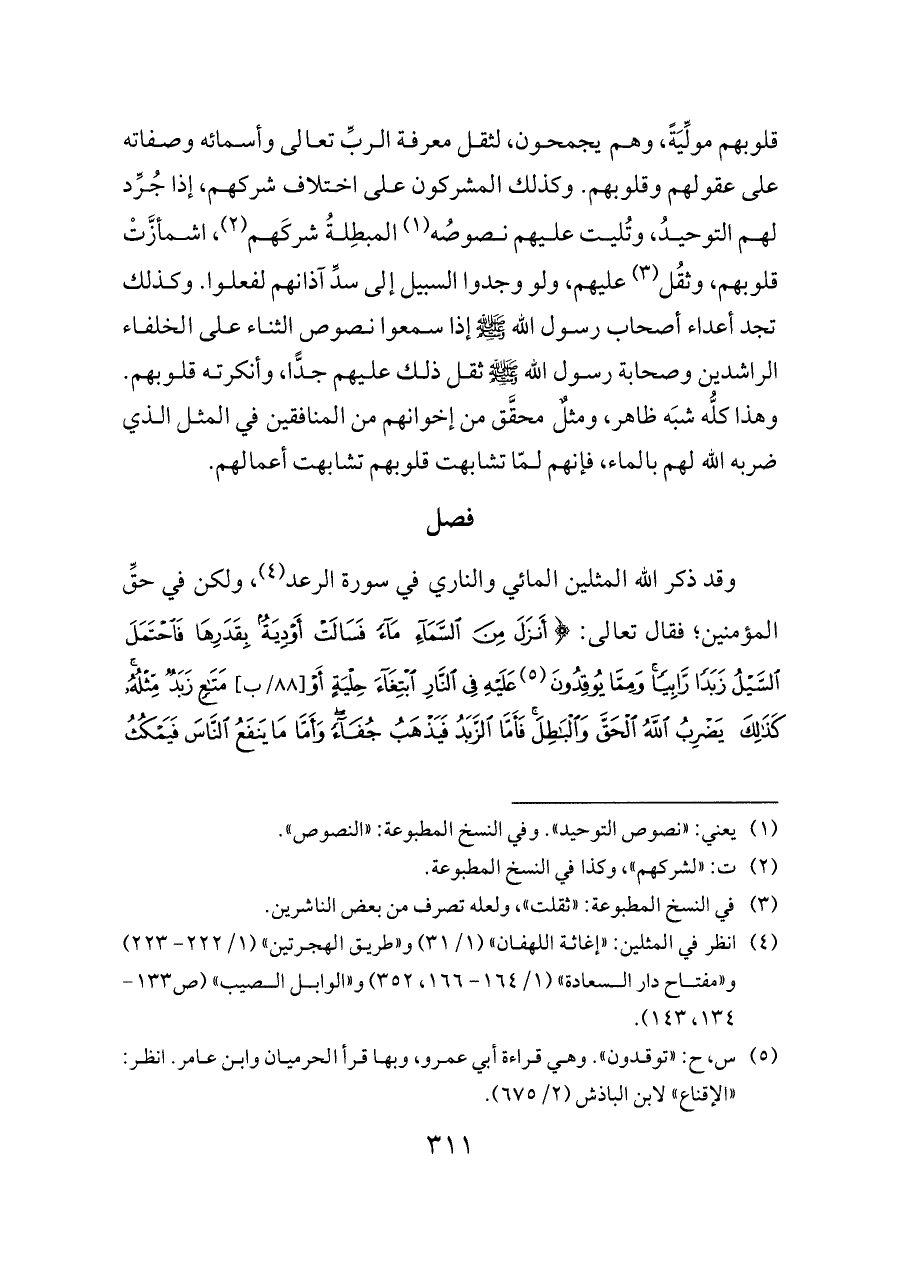 قلوبهم مولِّيَةً، وهم يجمحون، لثقل معرفة الربِّ تعالى وأسمائه وصفاته على عقولهم وقلوبهم. وكذلك المشركون على اختلاف شركهم، إذا جُرِّد لهم التوحيدُ، وتُليت عليهم نصوصُه (¬١) المبطِلةُ شركَهم (¬٢)، اشمأزَّتْ قلوبهم، وثقُل (¬٣) عليهم، ولو وجدوا السبيل إلى سدِّ آذانهم لفعلوا. وكذلك تجد أعداء أصحاب رسول الله - صلى الله عليه وسلم - إذا سمعوا نصوص الثناء على الخلفاء الراشدين وصحابة رسول الله - صلى الله عليه وسلم - ثقل ذلك عليهم جدًّا، وأنكرته قلوبهم. وهذا كلُّه شبَه ظاهر، ومثلٌ محقَّق من إخوانهم من المنافقين في المثل الذي ضربه الله لهم بالماء، فإنهم لمّا تشابهت قلوبهم تشابهت أعمالهم.