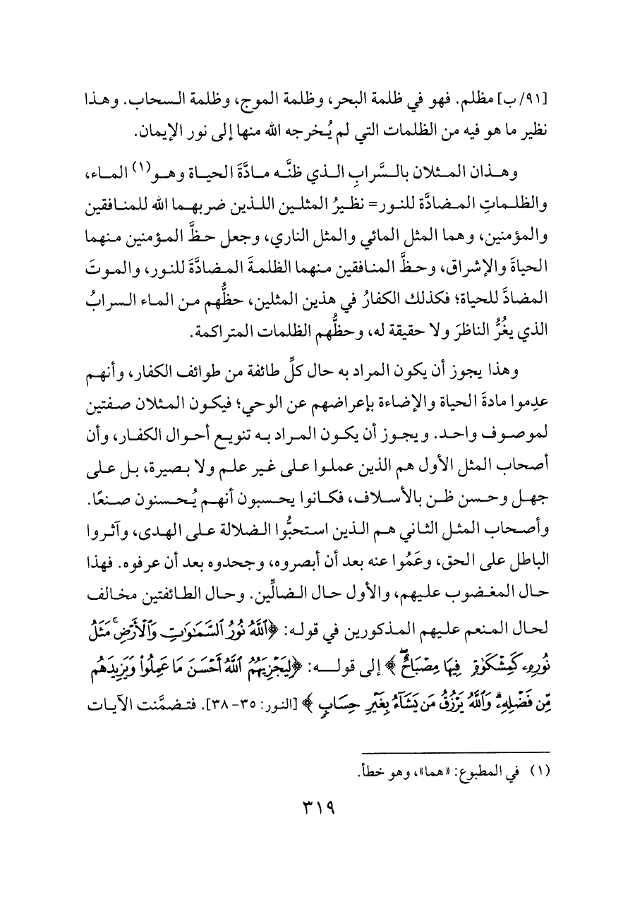 وهذان المثلان بالسَّرابِ الذي ظنَّه مادَّةَ الحياة وهو (¬١) الماء، والظلماتِ المضادَّة للنور= نظيرُ المثلين اللذين ضربهما الله للمنافقين والمؤمنين، وهما المثل المائي والمثل الناري، وجعل حظَّ المؤمنين منهما الحياةَ والإشراق، وحظَّ المنافقين منهما الظلمةَ المضادَّةَ للنور، والموتَ المضادَّ للحياة؛ فكذلك الكفارُ في هذين المثلين، حظُّهم من الماء السرابُ الذي يغُرُّ الناظرَ ولا حقيقة له، وحظُّهم الظلمات المتراكمة.