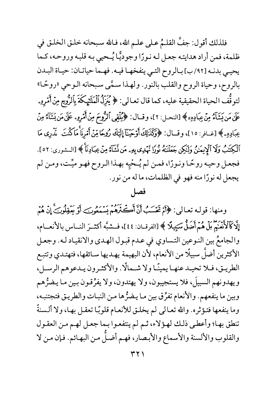 فلذلك أقول: جفَّ القلمُ على علم الله، فالله سبحانه خلق الخلق في ظلمة، فمن أراد هدايته جعل له نورًا وجوديًّا يُحيي به قلبه وروحه، كما يحيي بدنه [٩٢/ب] بالروح التي ينفخها فيه. فهما حياتان: حياة البدن بالروح، وحياة الروح والقلب بالنور. ولهذا سمَّى سبحانه الوحي "روحًا" لتوقُّف الحياة الحقيقية عليه، كما قال تعالى: {يُنَزِّلُ الْمَلَائِكَةَ بِالرُّوحِ مِنْ أَمْرِهِ عَلَى مَنْ يَشَاءُ مِنْ عِبَادِهِ} [النحل: ٢]، وقال: {يُلْقِي الرُّوحَ مِنْ أَمْرِهِ عَلَى مَنْ يَشَاءُ مِنْ عِبَادِهِ} [غافر: ١٥]، وقال: {وَكَذَلِكَ أَوْحَيْنَا إِلَيْكَ رُوحًا مِنْ أَمْرِنَا مَا كُنْتَ تَدْرِي مَا الْكِتَابُ وَلَا الْإِيمَانُ وَلَكِنْ جَعَلْنَاهُ نُورًا نَهْدِي بِهِ مَنْ نَشَاءُ مِنْ عِبَادِنَا} [الشورى: ٥٢]. فجعل وحيه روحًا ونورًا، فمن لم يُحْيِه بهذا الروح فهو ميِّت، ومن لم يجعل له نورًا منه فهو في الظلمات، ما له من نور.