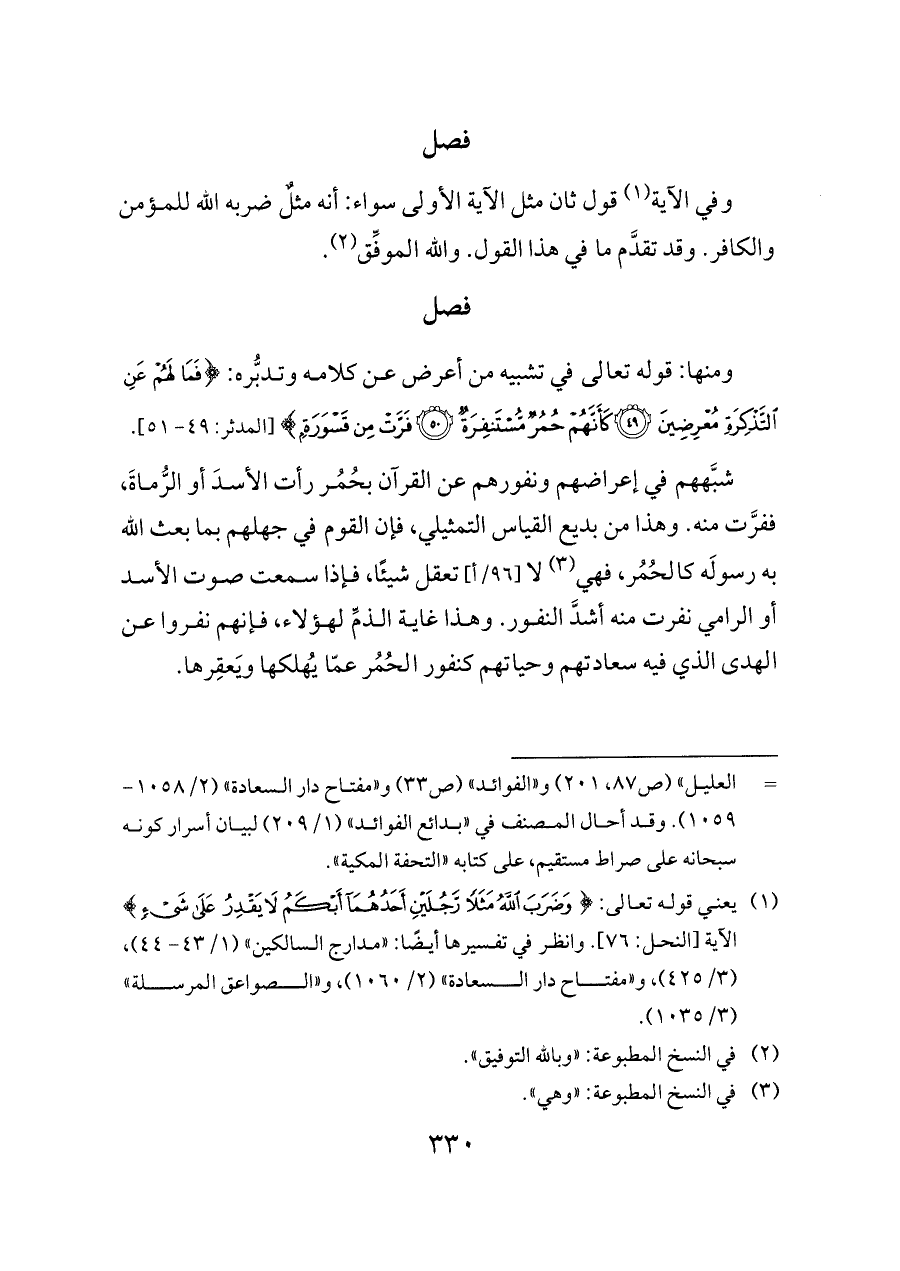 (¬١) يعني قوله تعالى: {وَضَرَبَ اللَّهُ مَثَلًا رَجُلَيْنِ أَحَدُهُمَا أَبْكَمُ لَا يَقْدِرُ عَلَى شَيْءٍ} الآية [النحل: ٧٦]. وانظر في تفسيرها أيضًا: "مدارج السالكين" (١/ ٤٣ - ٤٤)، (٣/ ٤٢٥)، و"مفتاح دار السعادة" (٢/ ١٠٦٠)، و"الصواعق المرسلة" (٣/ ١٠٣٥).