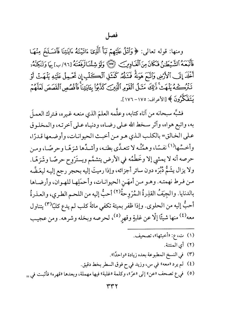 ومنها: قوله تعالى: {وَاتْلُ عَلَيْهِمْ نَبَأَ الَّذِي آتَيْنَاهُ آيَاتِنَا فَانْسَلَخَ مِنْهَا فَأَتْبَعَهُ الشَّيْطَانُ فَكَانَ مِنَ الْغَاوِينَ (١٧٥) وَلَوْ شِئْنَا لَرَفَعْنَاهُ [٩٦/ب] بِهَا وَلَكِنَّهُ أَخْلَدَ إِلَى الْأَرْضِ وَاتَّبَعَ هَوَاهُ فَمَثَلُهُ كَمَثَلِ الْكَلْبِ إِنْ تَحْمِلْ عَلَيْهِ يَلْهَثْ أَوْ تَتْرُكْهُ يَلْهَثْ ذَلِكَ مَثَلُ الْقَوْمِ الَّذِينَ كَذَّبُوا بِآيَاتِنَا فَاقْصُصِ الْقَصَصَ لَعَلَّهُمْ يَتَفَكَّرُونَ} [الأعراف: ١٧٥ - ١٧٦].