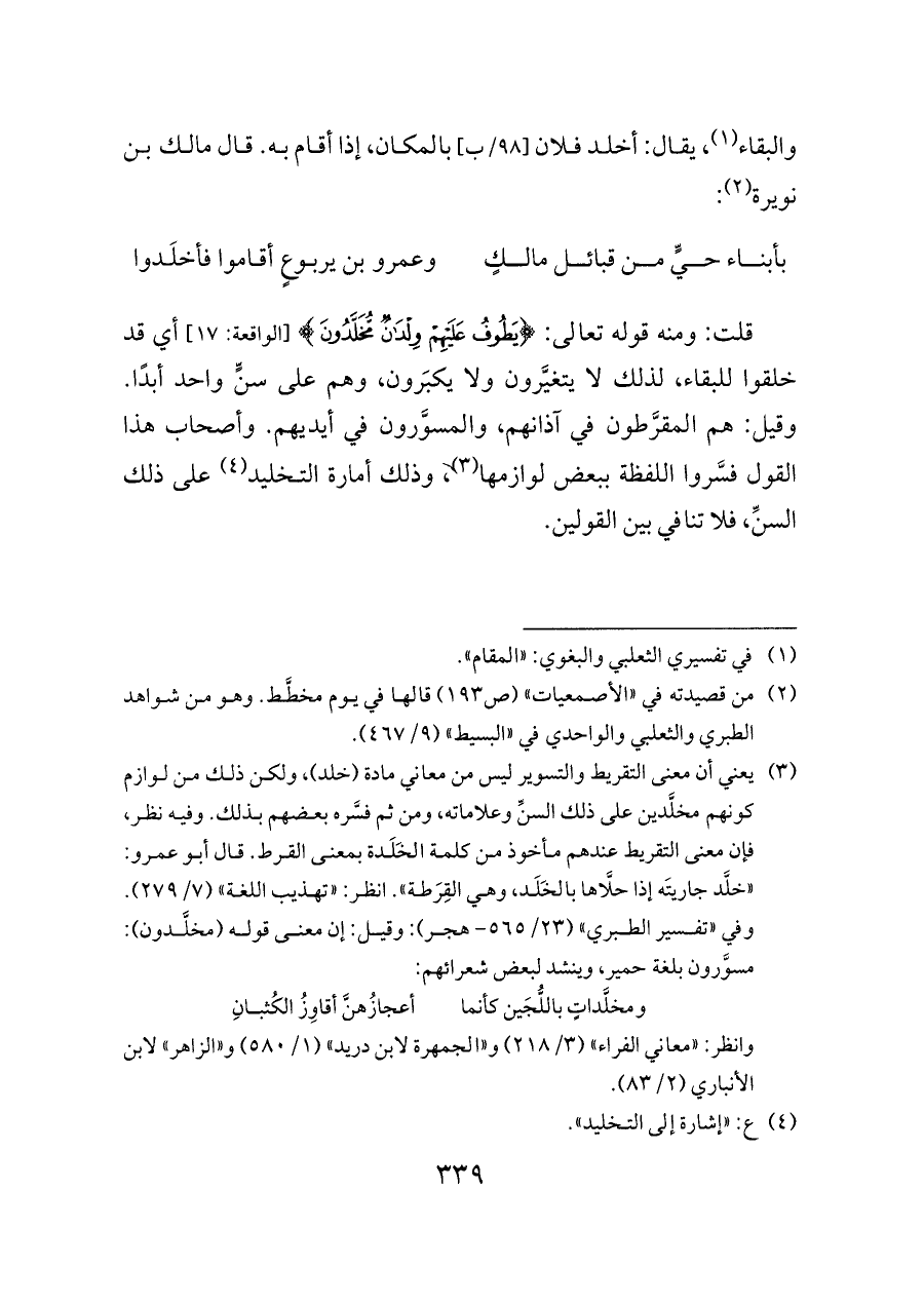 (¬٣) يعني أن معنى التقريط والتسوير ليس من معاني مادة (خلد)، ولكن ذلك من لوازم كونهم مخلَّدين على ذلك السنِّ وعلاماته، ومن ثم فسَّره بعضهم بذلك. وفيه نظر، فإن معنى التقريط عندهم مأخوذ من كلمة الخَلَدة بمعنى القرط. قال أبو عمرو: "خلَّد جاريتَه إذا حلَّاها بالخَلَد، وهي القِرَطة". انظر: "تهذيب اللغة" (٧/ ٢٧٩). وفي "تفسير الطبري" (٢٣/ ٥٦٥ - هجر): وقيل: إن معنى قوله (مخلَّدون): مسوَّرون بلغة حمير، وينشد لبعض شعرائهم: