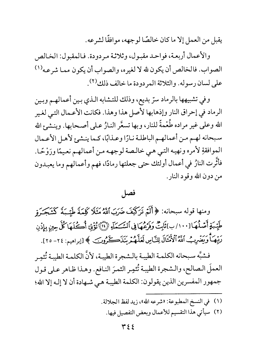 والأعمال أربعة، فواحد مقبول، وثلاثة مردودة. فالمقبول: الخالص الصواب. فالخالص أن يكون لله لا لغيره، والصواب أن يكون مما شرعه (¬١) على لسان رسوله. والثلاثة المردودة ما خالف ذلك (¬٢).