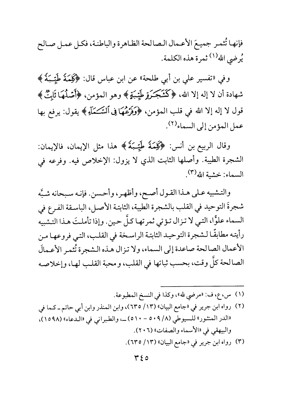 والتشبيه على هذا القول أصح، وأظهر، وأحسن. فإنه سبحانه شبَّه شجرةَ التوحيد في القلب بالشجرة الطيبة، الثابتة الأصل، الباسقة الفرع في السماء علوًّا، التي لا تزال تؤتي ثمرتها كلَّ حين. وإذا تأملتَ هذا التشبيه رأيته مطابقًا لشجرة التوحيد الثابتة الراسخة في القلب، التي فروعها من الأعمال الصالحة صاعدة إلى السماء، ولا تزال هذه الشجرة تُثمر الأعمالَ الصالحة كلَّ وقت، بحسب ثباتها في القلب، ومحبة القلب لها، وإخلاصه