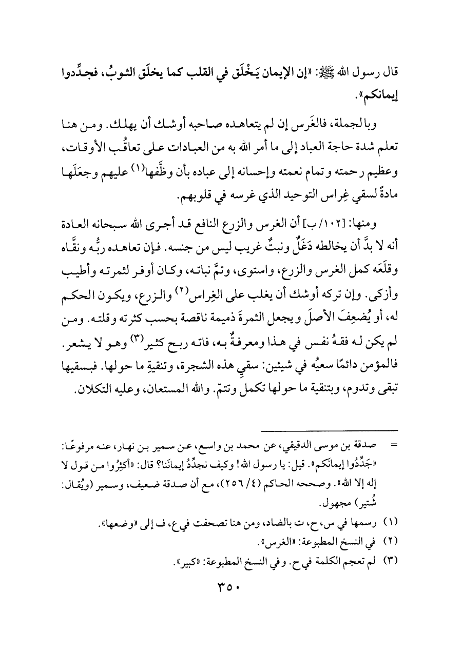 وبالجملة، فالغَرس إن لم يتعاهده صاحبه أوشك أن يهلك. ومن هنا تعلم شدة حاجة العباد إلى ما أمر الله به من العبادات على تعاقُب الأوقات، وعظيم رحمته وتمام نعمته وإحسانه إلى عباده بأن وظَّفها (¬١) عليهم وجعَلَها مادةً لسقي غِراس التوحيد الذي غرسه في قلوبهم.