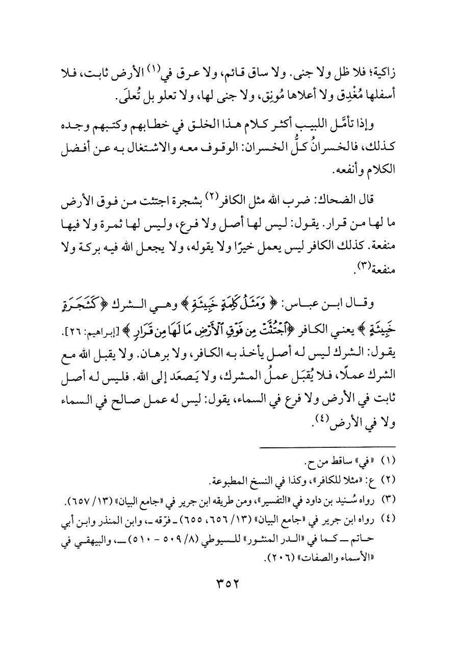 وقال ابن عباس: {وَمَثَلُ كَلِمَةٍ خَبِيثَةٍ} وهي الشرك {كَشَجَرَةٍ خَبِيثَةٍ} يعني الكافر {اجْتُثَّتْ مِنْ فَوْقِ الْأَرْضِ مَا لَهَا مِنْ قَرَارٍ} [إبراهيم: ٢٦]. يقول: الشرك ليس له أصل يأخذ به الكافر، ولا برهان. ولا يقبل الله مع الشرك عملًا، فلا يُقبَل عملُ المشرك، ولا يَصعَد إلى الله. فليس له أصل ثابت في الأرض ولا فرع في السماء، يقول: ليس له عمل صالح في السماء ولا في الأرض (¬٤).