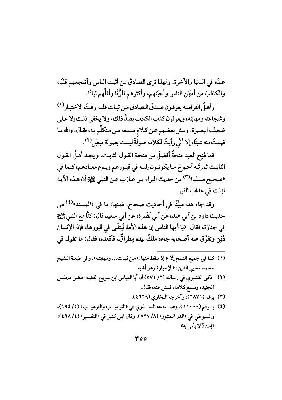 وأهلُ الفراسة يعرفون صدقَ الصادق من ثبات قلبه وقتَ الاختبار (¬١) وشجاعته ومهابته، ويعرفون كذب الكاذب بضدِّ ذلك، ولا يخفى ذلك إلا على ضعيف البصيرة. وسئل بعضهم عن كلامٍ سمعه من متكلِّم به، فقال: والله ما فهمتُ منه شيئًا، إلا أنِّي رأيتُ لكلامه صولةً ليست بصولة مبطِل (¬٢).