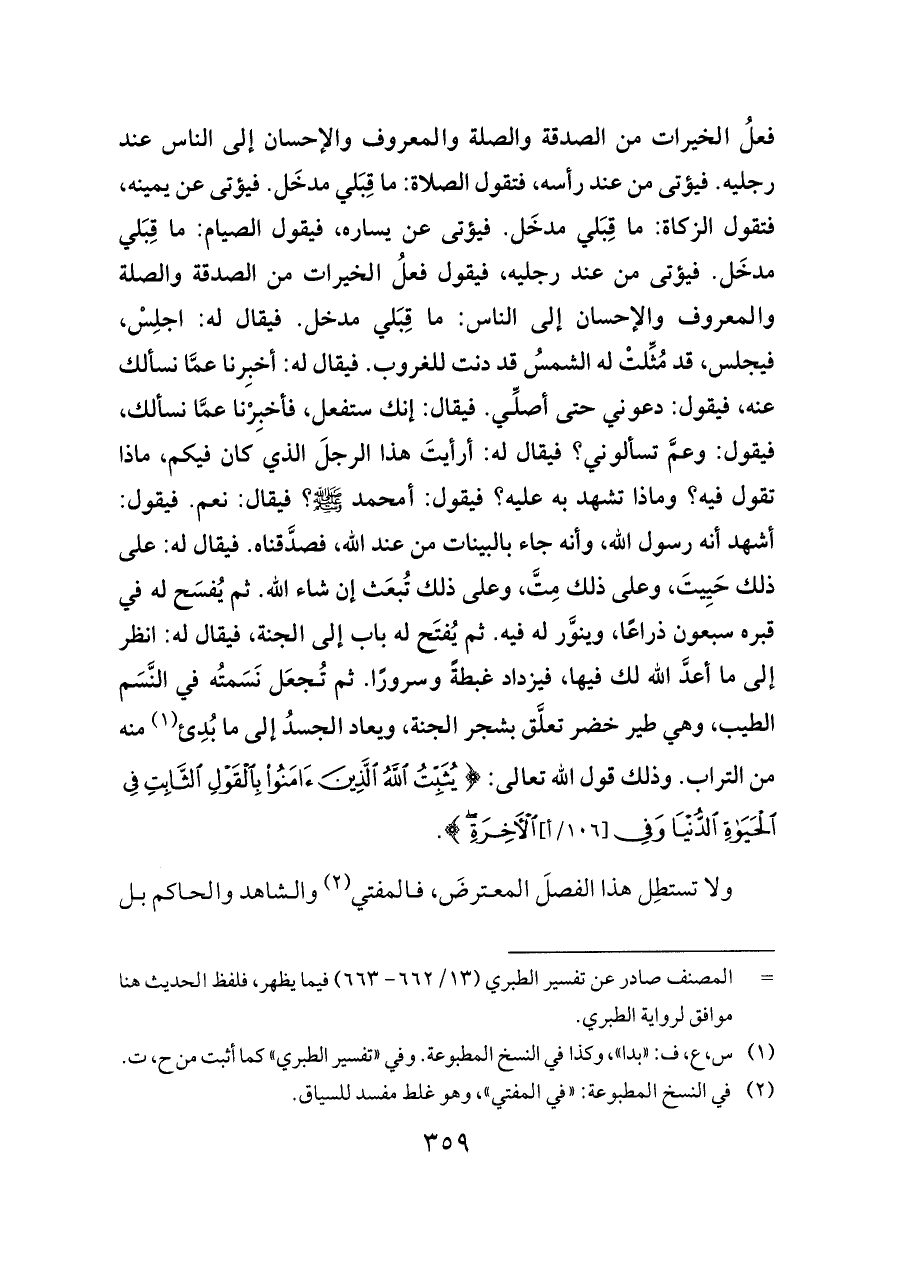 فعلُ الخيرات من الصدقة والصلة والمعروف والإحسان إلى الناس عند رجليه. فيؤتى من عند رأسه، فتقول الصلاة: ما قِبَلي مدخَل. فيؤتى عن يمينه، فتقول الزكاة: ما قِبَلي مدخَل. فيؤتى عن يساره، فيقول الصيام: ما قِبَلي مدخَل. فيؤتى من عند رجليه، فيقول فعلُ الخيرات من الصدقة والصلة والمعروف والإحسان إلى الناس: ما قِبَلي مدخل. فيقال له: اجلِسْ، فيجلس، قد مُثِّلتْ له الشمسُ قد دنت للغروب. فيقال له: أخبِرنا عمَّا نسألك عنه، فيقول: دعوني حتى أصلِّي. فيقال: إنك ستفعل، فأخبِرْنا عمَّا نسألك، فيقول: وعمَّ تسألوني؟ فيقال له: أرأيتَ هذا الرجلَ الذي كان فيكم، ماذا تقول فيه؟ وماذا تشهد به عليه؟ فيقول: أمحمد - صلى الله عليه وسلم -؟ فيقال: نعم. فيقول: أشهد أنه رسول الله، وأنه جاء بالبينات من عند الله، فصدَّقناه. فيقال له: على ذلك حَيِيتَ، وعلى ذلك مِتَّ، وعلى ذلك تُبعَث إن شاء الله. ثم يُفسَح له في قبره سبعون ذراعًا، وينوَّر له فيه. ثم يُفتَح له باب إلى الجنة، فيقال له: انظر إلى ما أعدَّ الله لك فيها، فيزداد غبطةً وسرورًا. ثم تُجعَل نَسَمتُه في النَّسَم الطيب، وهي طير خضر تعلَّق بشجر الجنة، ويعاد الجسدُ إلى ما بُدِئ (¬١) منه من التراب. وذلك قول الله تعالى: {يُثَبِّتُ اللَّهُ الَّذِينَ آمَنُوا بِالْقَوْلِ الثَّابِتِ فِي الْحَيَاةِ الدُّنْيَا وَفِي [١٠٦/أ] الْآخِرَةِ}.