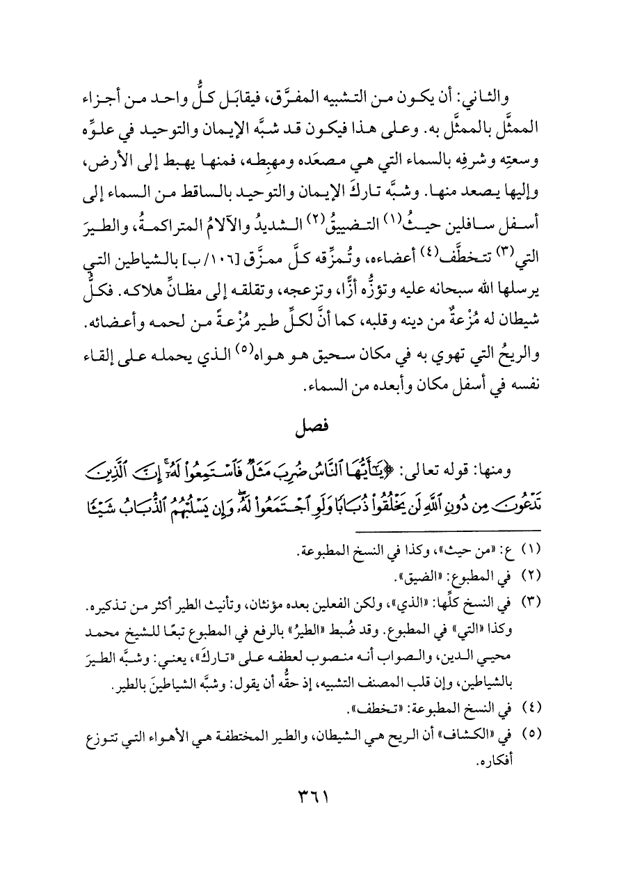 (¬٣) في النسخ كلِّها: "الذي"، ولكن الفعلين بعده مؤنثان، وتأنيث الطير أكثر من تذكيره. وكذا "التي" في المطبوع. وقد ضُبط "الطيرُ" بالرفع في المطبوع تبعًا للشيخ محمد محيي الدين، والصواب أنه منصوب لعطفه على "تاركَ"، يعني: وشبَّه الطيرَ بالشياطين، وإن قلب المصنف التشبيه، إذ حقُّه أن يقول: وشبَّه الشياطينَ بالطير.