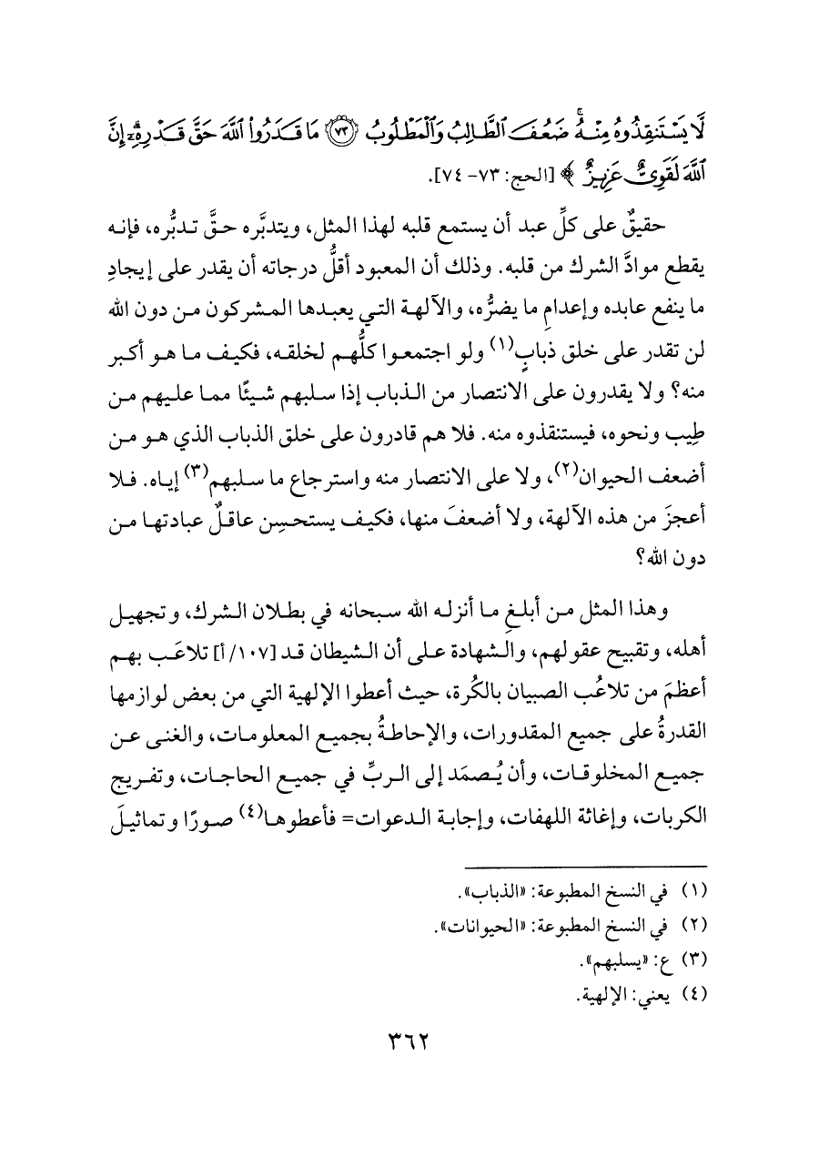 لَا يَسْتَنْقِذُوهُ مِنْهُ ضَعُفَ الطَّالِبُ وَالْمَطْلُوبُ (٧٣) مَا قَدَرُوا اللَّهَ حَقَّ قَدْرِهِ إِنَّ اللَّهَ لَقَوِيٌّ عَزِيزٌ} [الحج: ٧٣ - ٧٤].