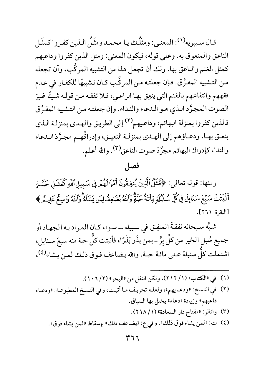 قال سيبويه (¬١): المعنى: ومثَلُك يا محمد ومثَلُ الذين كفروا كمثَل الناعق والمنعوق به. وعلى قوله، فيكون المعنى: ومثل الذين كفروا وداعيهم كمثل الغنم والناعق بها. ولك أن تجعل هذا من التشبيه المركَّب، وأن تجعله من التشبيه المفرَّق. فإن جعلته من المركَّب كان تشبيهًا للكفار في عدم فقههم وانتفاعهم بالغنم التي ينعِق بها الراعي، فلا تفقه من قوله شيئًا غيرَ الصوت المجرَّد الذي هو الدعاء والنداء. وإن جعلته من التشبيه المفرَّق فالذين كفروا بمنزلة البهائم، وداعيهم (¬٢) إلى الطريق والهدى بمنزلة الذي ينعق بها، ودعاؤهم إلى الهدى بمنزلة النعيق، وإدراكُهم مجرَّدَ الدعاء والنداء كإدراك البهائم مجرَّدَ صوت الناعق (¬٣). والله أعلم.