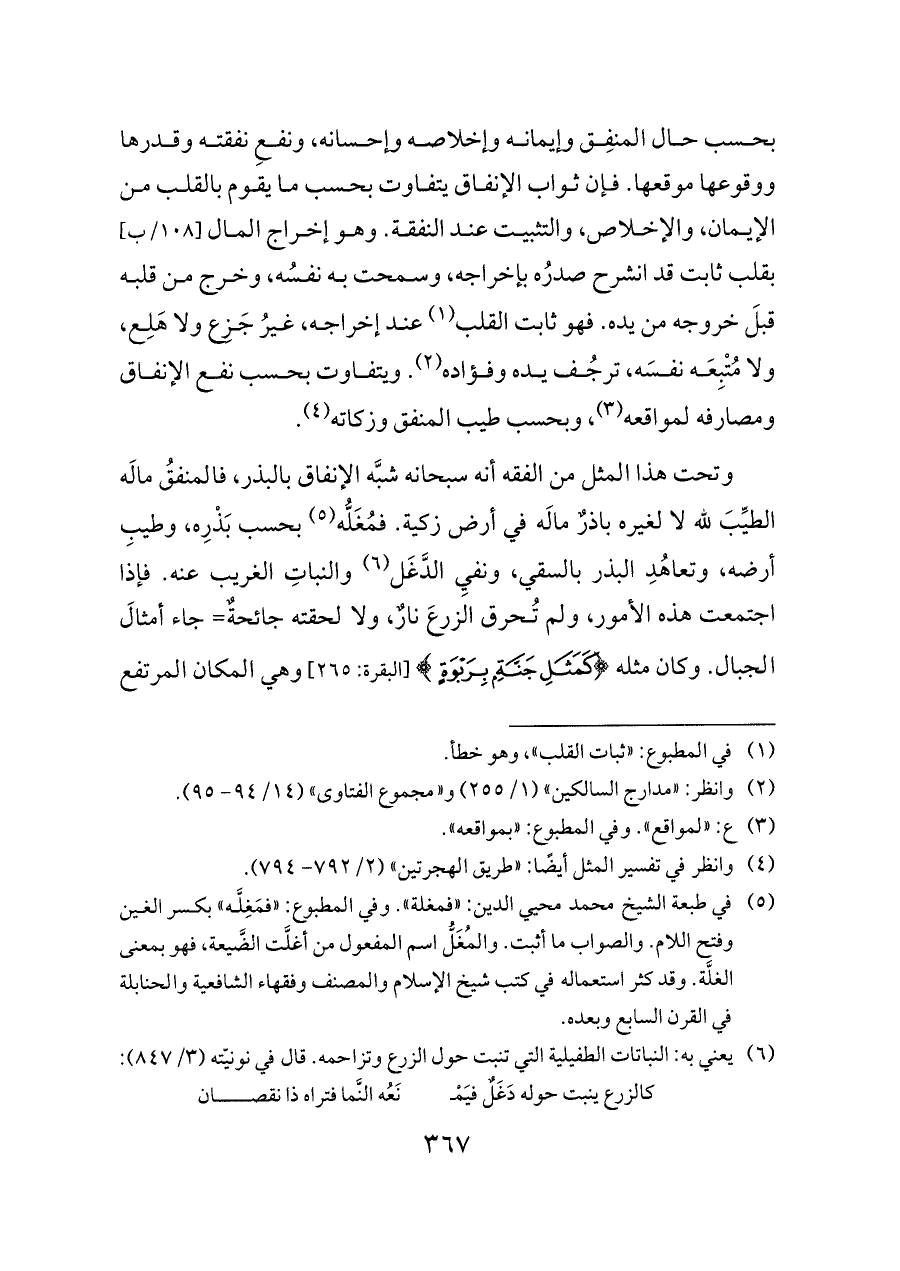 وتحت هذا المثل من الفقه أنه سبحانه شبَّه الإنفاق بالبذر، فالمنفقُ مالَه الطيِّبَ لله لا لغيره باذرٌ مالَه في أرض زكية. فمُغَلُّه (¬٥) بحسب بَذْرِه، وطيبِ أرضه، وتعاهُدِ البذر بالسقي، ونفيِ الدَّغَل (¬٦)