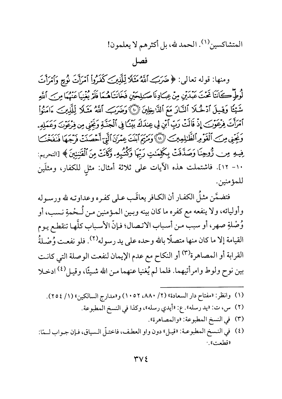 فتضمَّن مثلُ الكفار أن الكافر يعاقَب على كفره وعداوته لله ورسوله وأوليائه، ولا ينفعه مع كفره ما كان بينه وبين المؤمنين من لُحْمةِ نسب، أو وُصْلةِ صهر، أو سبب من أسباب الاتصال؛ فإنّ الأسباب كلَّها تنقطع يوم القيامة إلا ما كان منها متصلًا بالله وحده على يد رسوله (¬٢). فلو نفعت وُصْلةُ القرابة أو المصاهرة (¬٣) أو النكاح مع عدم الإيمان لنفعت الوصلة التي كانت بين نوح ولوط وامرأتيهما. فلما لم يُغنيا عنهما من الله شيئًا، وقيل (¬٤) ادخلا