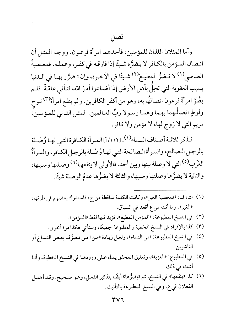 فذكر ثلاثة أصناف النساء (¬٤): [١١٢/أ] المرأة الكافرة التي لها وُصْلة بالرجل الصالح، والمرأة الصالحة التي لها وُصْلة بالرجل الكافر، والمرأةُ العَزَب (¬٥) التي لا وصلة بينها وبين أحد. فالأولى لا ينفعها (¬٦) وصلتها وسببها، والثانية لا يضرُّها وصلتها وسببها، والثالثة لا يضرُّها عدمُ الوصلة شيئًا.