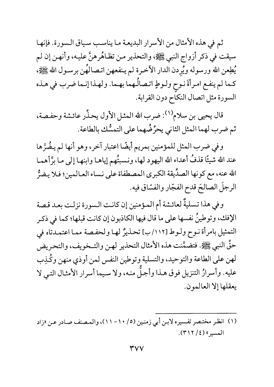 وفي هذا تسليةٌ لعائشة أم المؤمنين إن كانت السورة نزلت بعد قصة الإفك، وتوطينُ نفسها على ما قال فيها الكاذبون إن كانت قبلها؛ كما في ذكر التمثيل بامرأة نوح ولوط [١١٢/ب] تحذيرٌ لها ولحفصة مما اعتمدتاه في حقِّ النبي - صلى الله عليه وسلم -. فتضمَّنت هذه الأمثال التحذير لهن والتخويف، والتحريض لهن على الطاعة والتوحيد، والتسلية وتوطين النفس لمن أوذي منهن وكُذِب عليه. وأسرارُ التنزيل فوق هذا وأجلُّ منه، ولا سيما أسرار الأمثال التي لا يعقلها إلا العالمون.