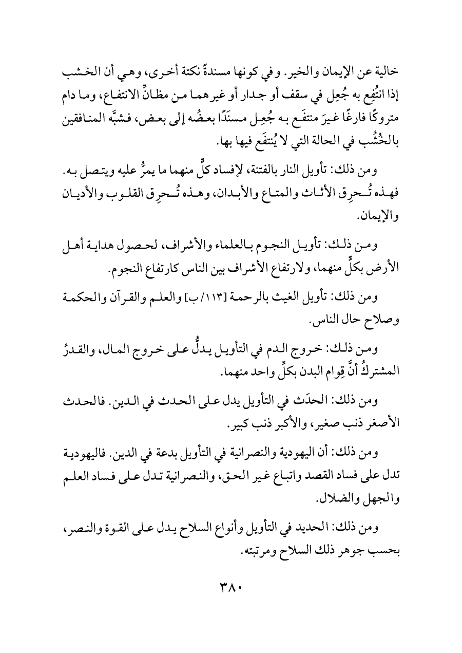 ومن ذلك: تأويل النار بالفتنة، لإفساد كلٍّ منهما ما يمرُّ عليه ويتصل به. فهذه تُحرِق الأثاث والمتاع والأبدان، وهذه تُحرِق القلوب والأديان والإيمان.