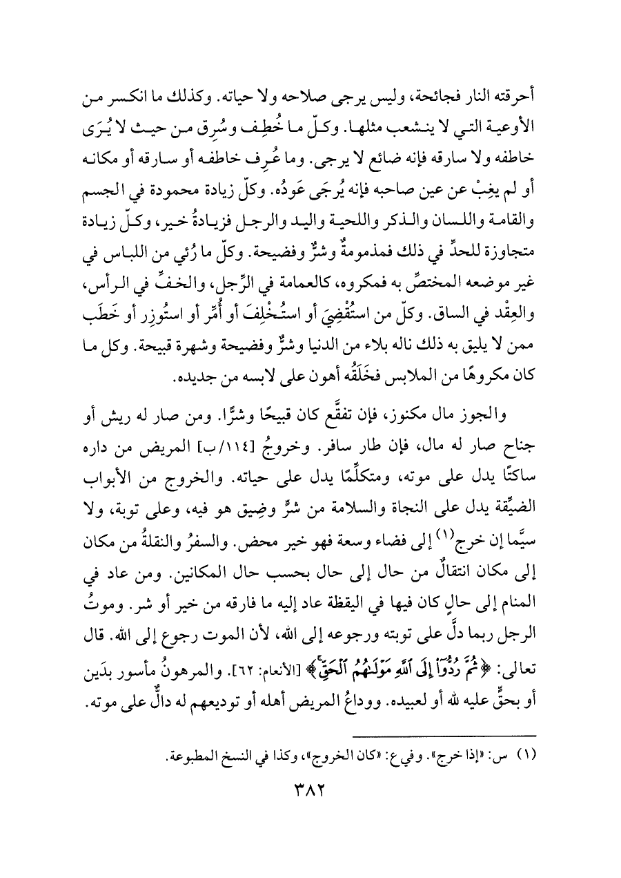 والجوز مال مكنوز، فإن تفقَّع كان قبيحًا وشرًّا. ومن صار له ريش أو جناح صار له مال، فإن طار سافر. وخروجُ [١١٤/ب] المريض من داره ساكتًا يدل على موته، ومتكلِّمًا يدل على حياته. والخروج من الأبواب الضيِّقة يدل على النجاة والسلامة من شرٍّ وضِيق هو فيه، وعلى توبة، ولا سيَّما إن خرج (¬١) إلى فضاء وسعة فهو خير محض. والسفرُ والنقلةُ من مكان إلى مكان انتقالٌ من حال إلى حال بحسب حال المكانين. ومن عاد في المنام إلى حالٍ كان فيها في اليقظة عاد إليه ما فارقه من خير أو شر. وموتُ الرجل ربما دلَّ على توبته ورجوعه إلى الله، لأن الموت رجوع إلى الله. قال تعالى: {ثُمَّ رُدُّوا إِلَى اللَّهِ مَوْلَاهُمُ الْحَقِّ} [الأنعام: ٦٢]. والمرهونُ مأسور بدَين أو بحقٍّ عليه لله أو لعبيده. ووداعُ المريض أهله أو توديعهم له دالٌّ على موته.
